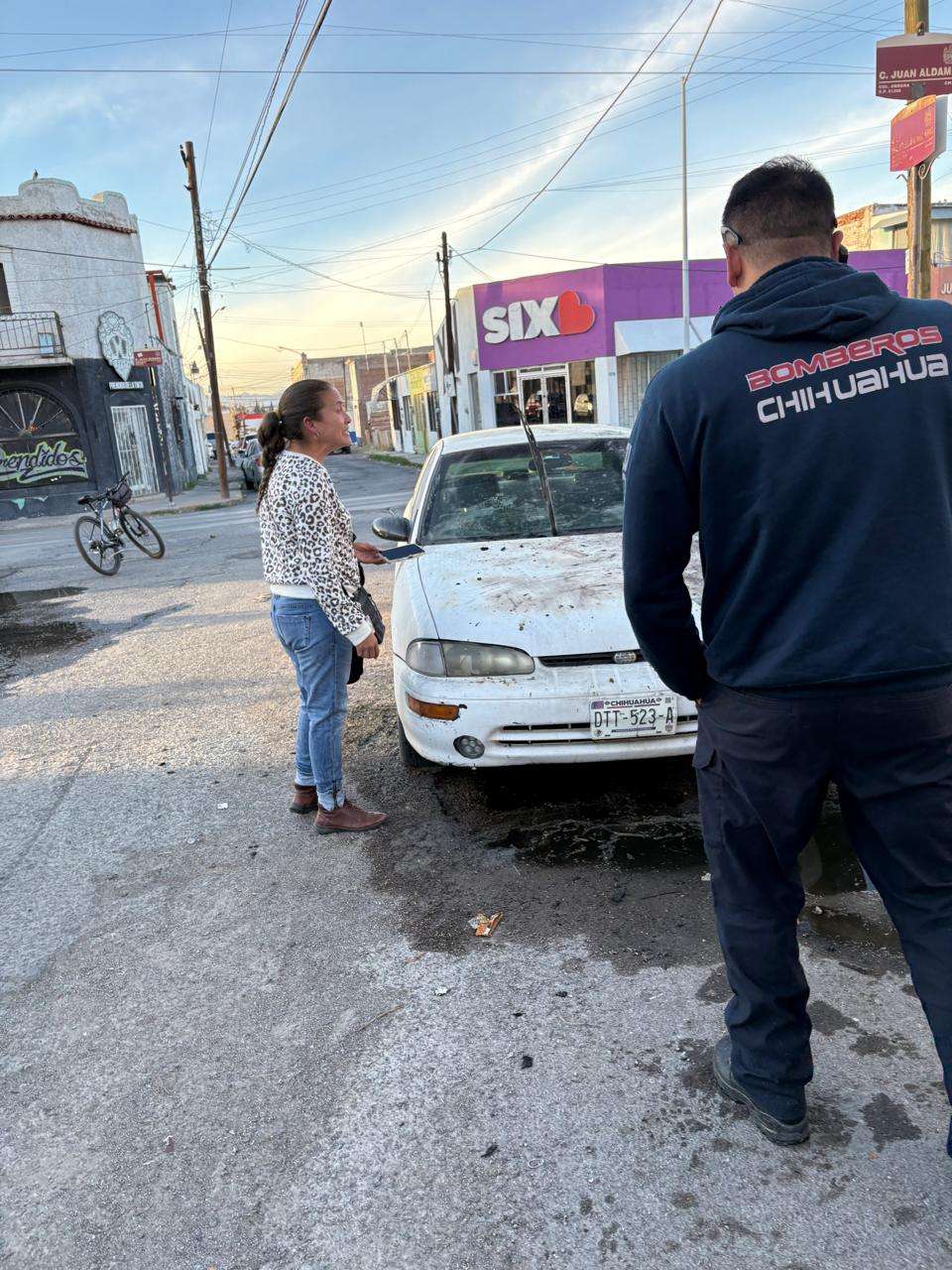 Junto a la palmera se encontraba estacionado un vehículo Geo Prizm color blanco, el cual fue empujado por ciudadanos para evitar mayores daños; sin embargo, la unidad presentó afectaciones en el vidrio panorámico, cofre, salpicadera, espejo y toldo, a consecuencia del fuego y de los cables ardiendo que cayeron sobre el automóvil.