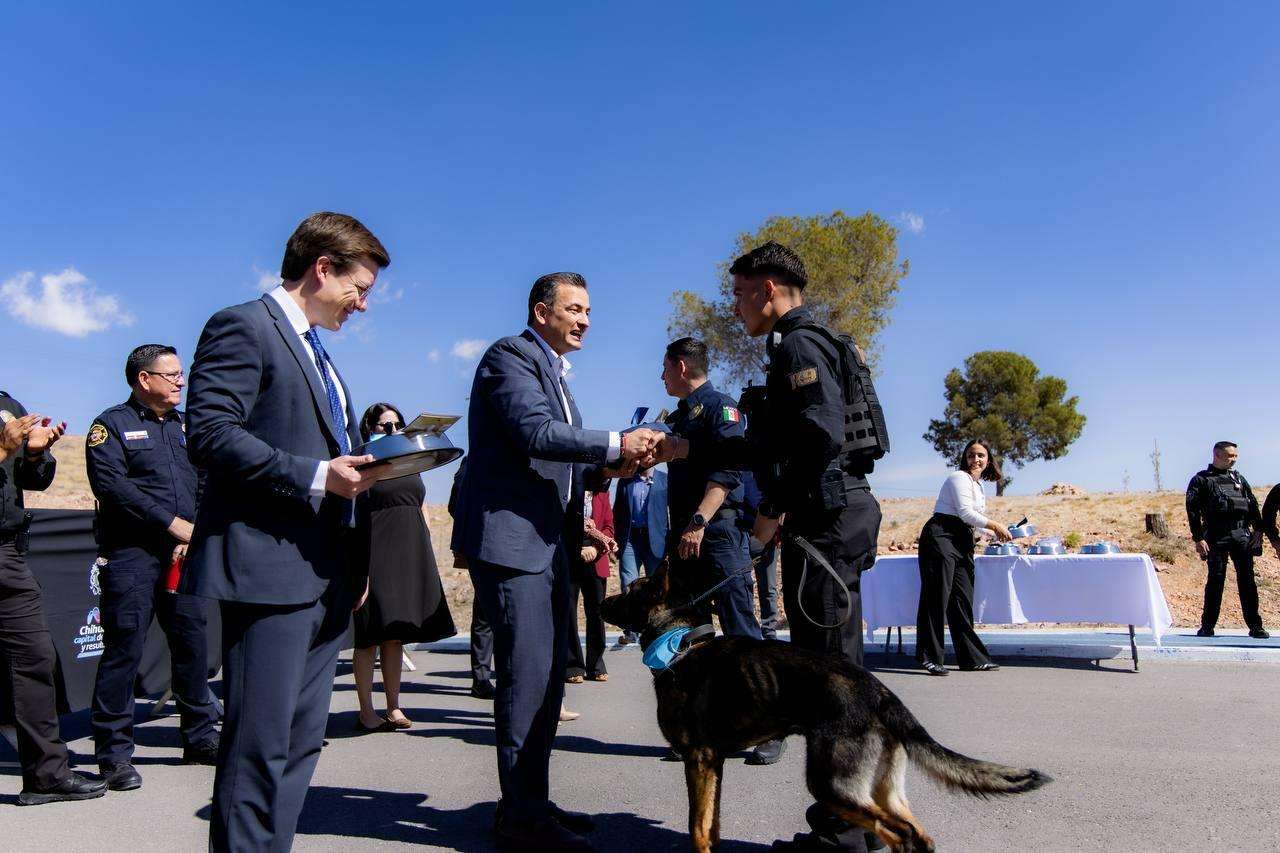 Chihuahua.- El alcalde Marco Bonilla presentó 10 nuevos elementos caninos que se integran al grupo K-9 de la Policía Municipal, fortaleciendo las capacidades de la corporación para detectar drogas, explosivos y participar en operativos estratégicos.