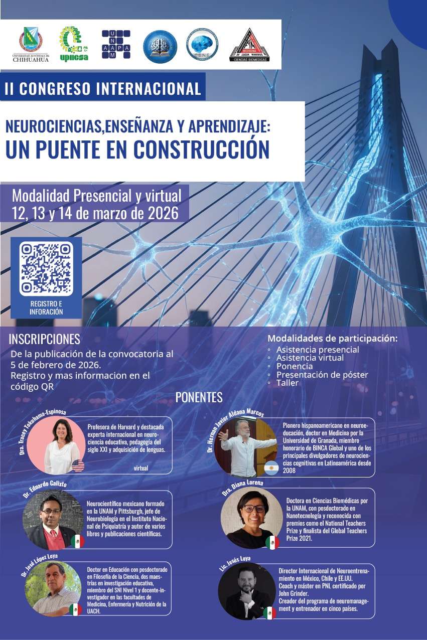 Chihuahua.- Con el propósito de fortalecer el diálogo entre la ciencia, la educación y la salud, se llevará a cabo el II Congreso Internacional "Neurociencias, Enseñanza y Aprendizaje: un puente en construcción", los días 12, 13 y 14 de marzo de 2026, en modalidad presencial y virtual.