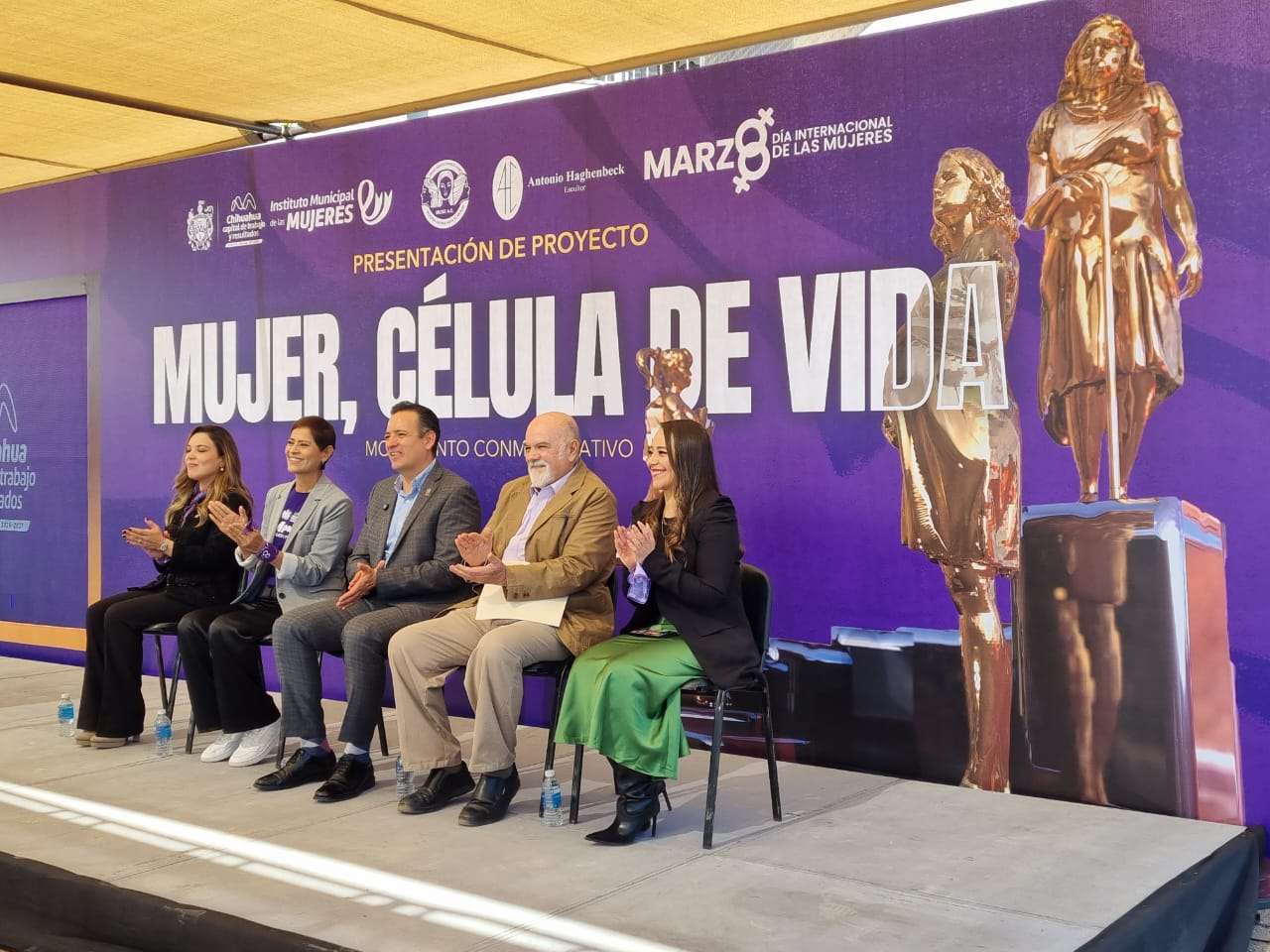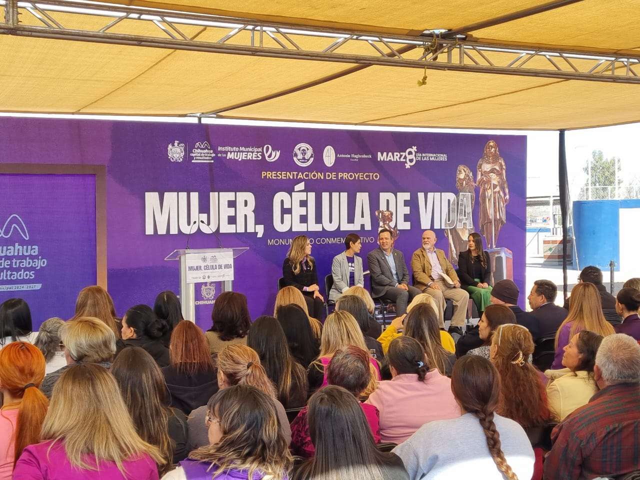 Chihuahua.- Esta mañana, en el marco de la celebración del Día Internacional de la Mujer, se presentó en las instalaciones del parque fundadores, también conocido como la Huerta Legarreta, la escultura titulada "Mujer, Célula de Vida", creación del escultor José Antonio del Sagrado Corazón Haghenckbeck.