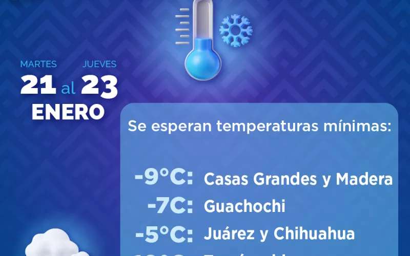 En Juárez y Chihuahua se espera un amanecer con valores de -5 grados centígrados (°C), con máximas de 6 °C; en Madera -9°C y máxima de 7°C, Temósachic -10°C como mínima y 8°C como máxima, para Cuauhtémoc será -7°C y 4°C y en Ojinaga de -2°C y 7°C.