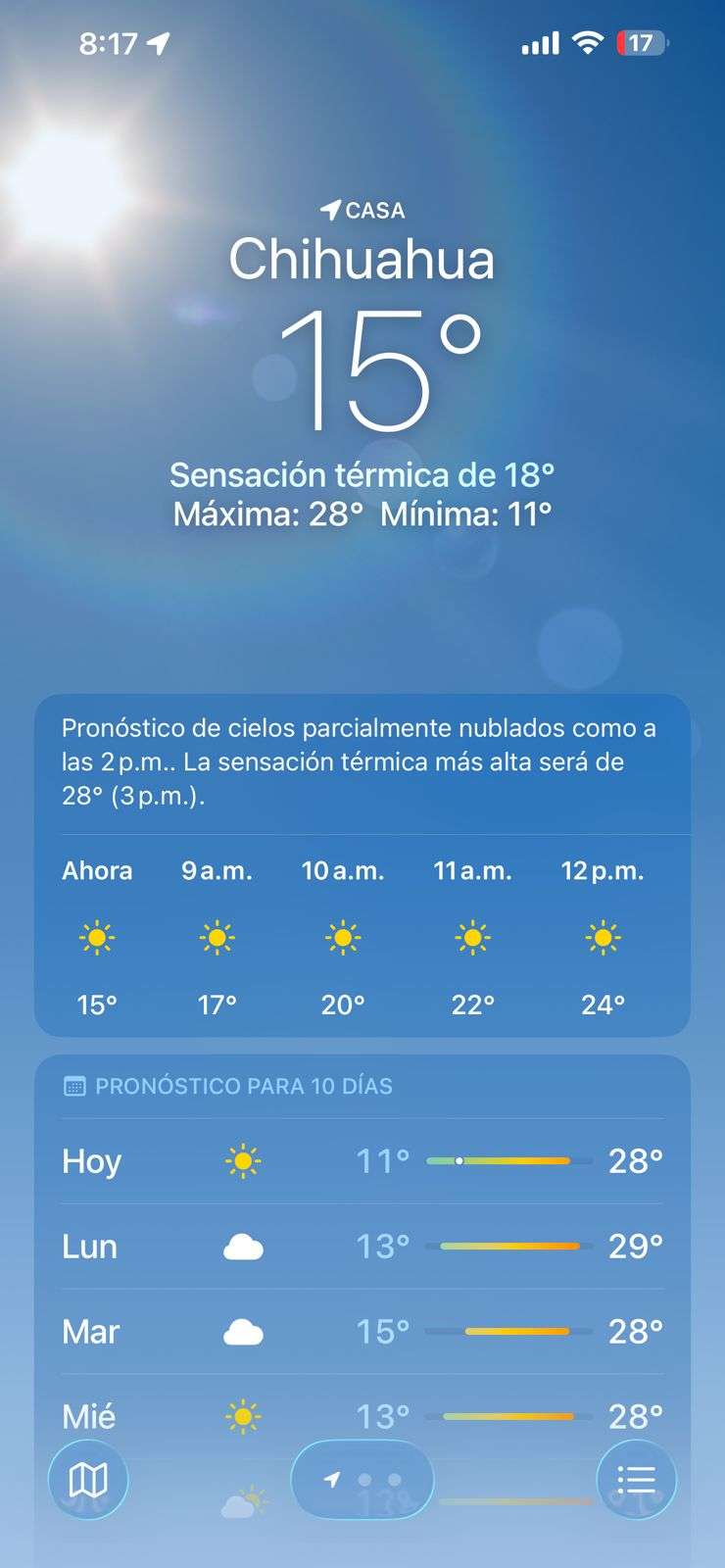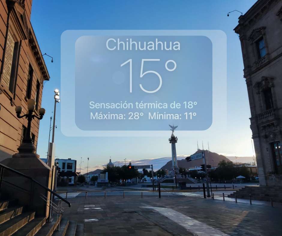 Chihuahua. - Para este domingo 12 de abril, la ciudad de Chihuahua inició la jornada con una temperatura de 15 grados, perfilando una tarde que alcanzará una máxima de 28 grados según los reportes digitales. No obstante, la Coordinación Estatal de Protección Civil proyecta una variación en el termómetro, estimando que la máxima podría llegar hasta los 29 grados, mientras que la mínima será de 11 grados durante las horas más frescas del día.