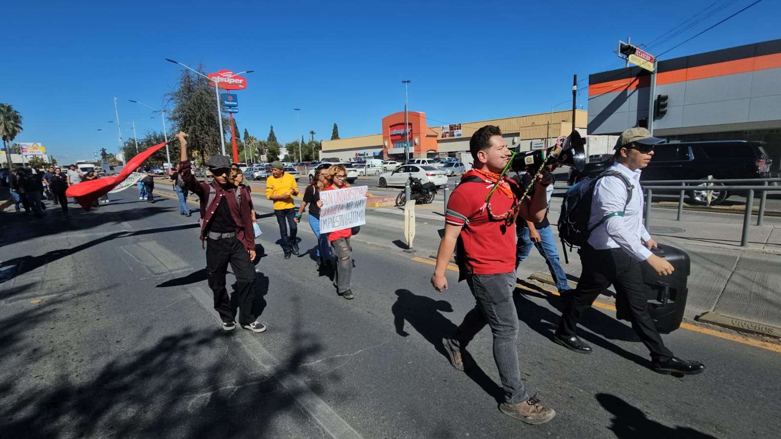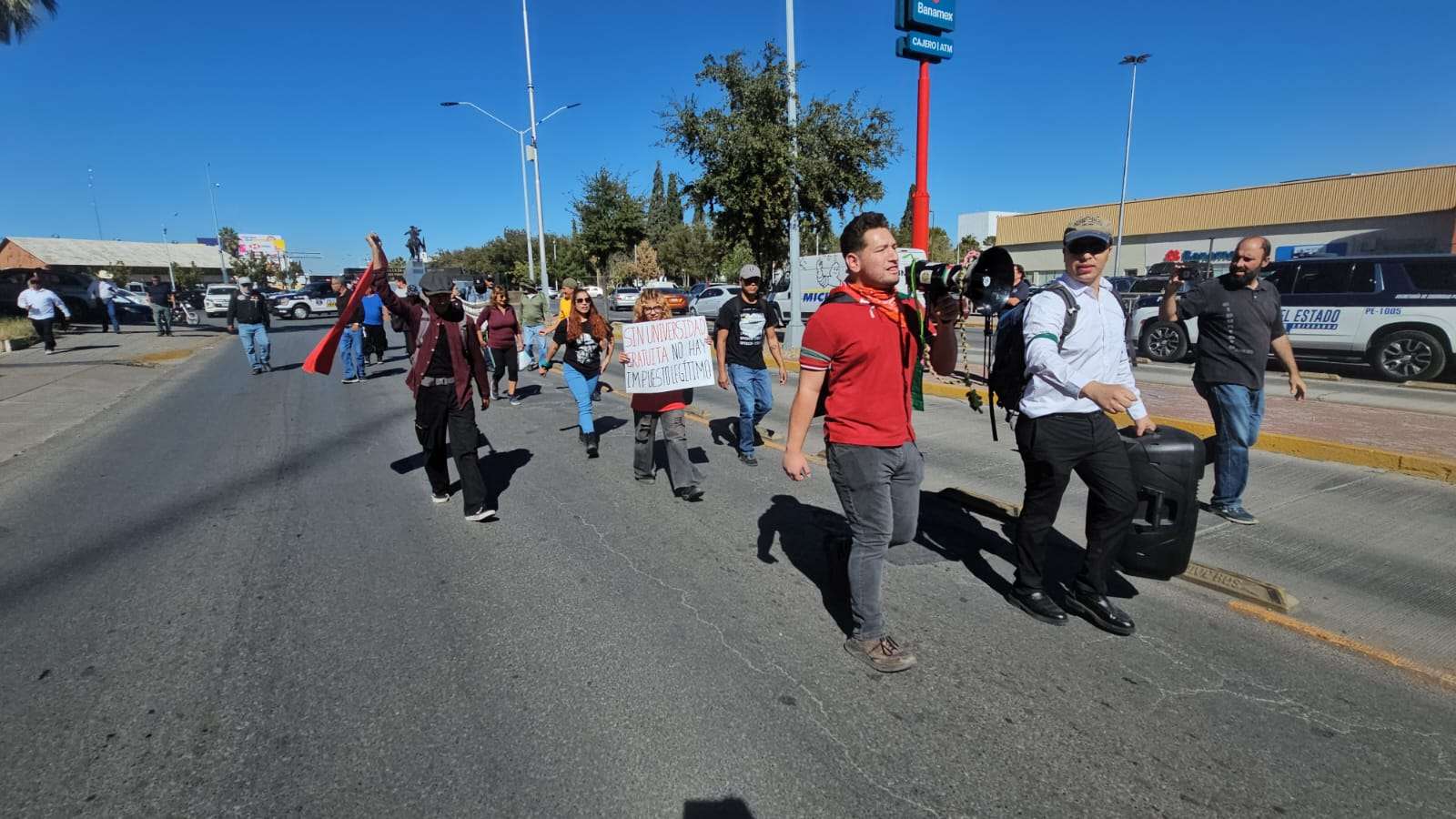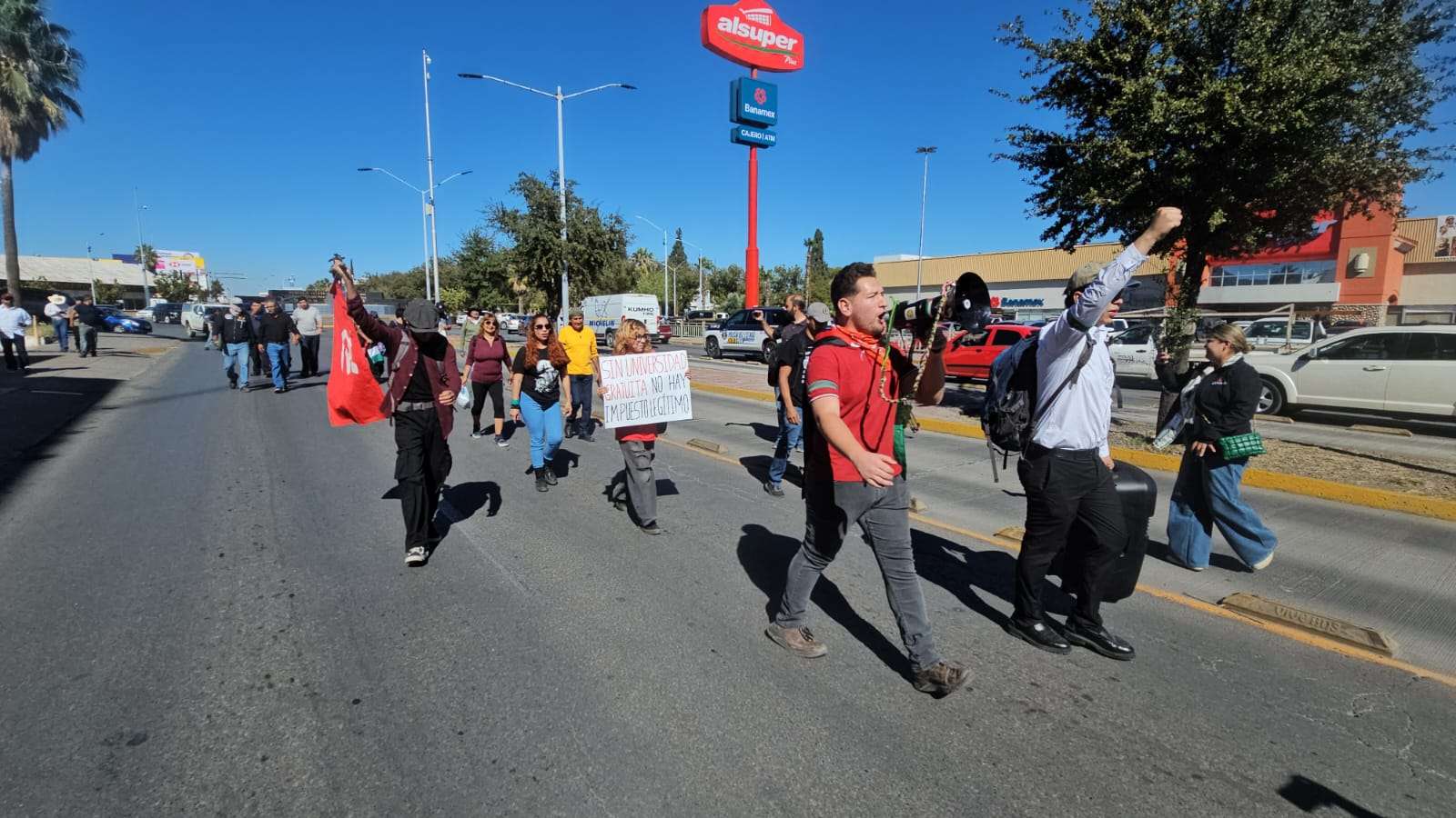 Los manifestantes avanzaron lanzando consignas como “el concepto de accesorios es saqueo obligatorio”, “el cobro de accesorios es abuso obligatorio” y “respeto al trabajador”, exigiendo a la gobernadora revisar y frenar lo que califican como un cobro injustificado dentro del esquema recaudatorio estatal.