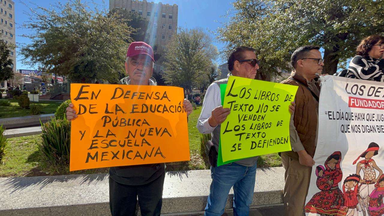 Chihuahua.- Frente a las instalaciones del Congreso del Estado, Rosalilia Cardona Muñoz, acompañada por integrantes de la agrupación civil "Los de Abajo", encabezó una protesta para manifestar su rechazo a la reciente remoción de Marx Arriaga Navarro como titular de la Dirección General de Materiales Educativos de la Secretaría de Educación Pública (SEP).