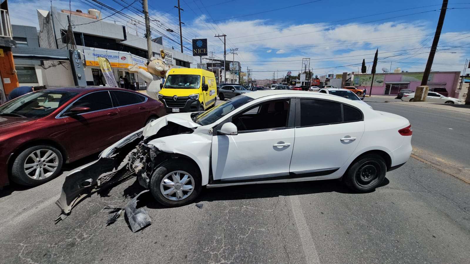 Chihuahua.- La conductora de una camioneta Honda HR-V provocó un fuerte accidente luego de salir de un estacionamiento de Farmacias Similares, ubicado sobre la avenida De las Américas.