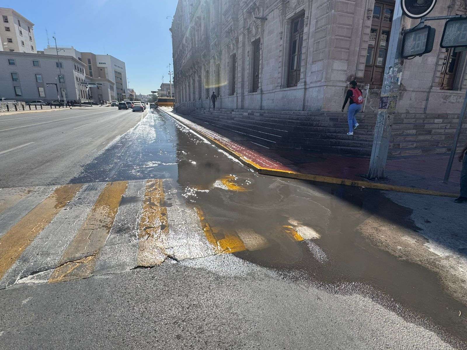 Chihuahua.– Una considerable fuga de agua se registró en el cruce de las calles Venustiano Carranza y Aldama, desde la Ocampo, justo frente a Palacio de Gobierno, provocando que el pavimento permaneciera completamente mojado y afectando el paso peatonal y vehicular en la zona.
