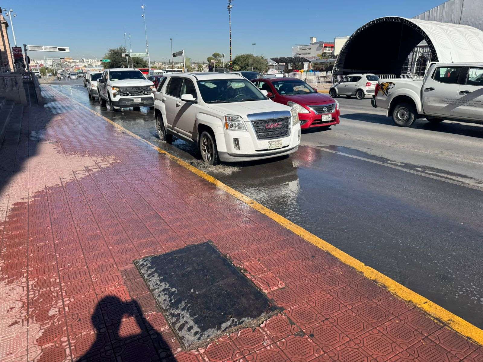 El agua corre desde la banqueta hacia la calle, generando encharcamientos que dificultan el tránsito, además de representar un riesgo de resbalones para las personas que caminan por el área.