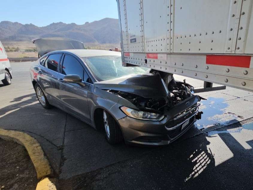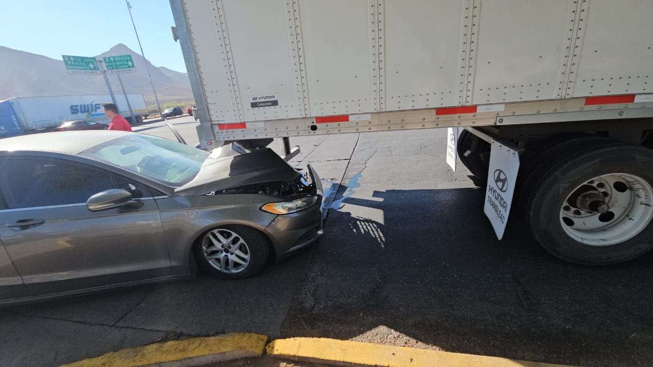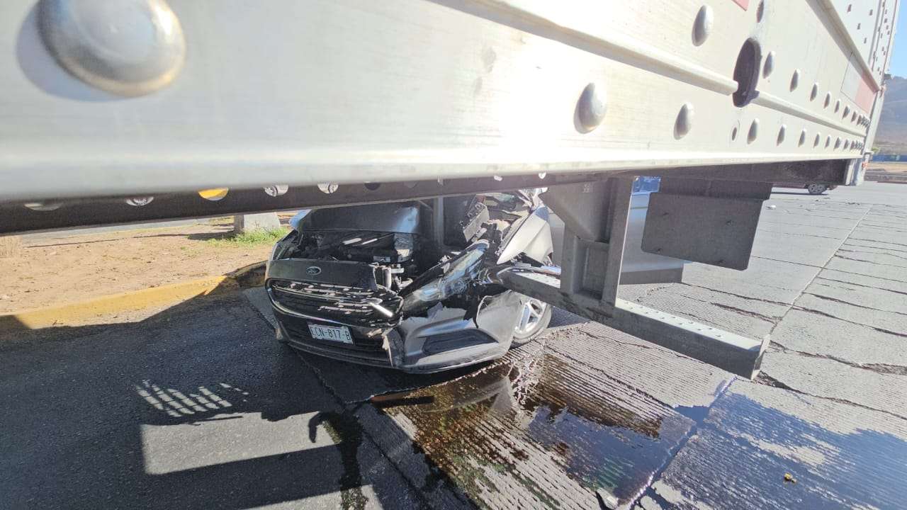 Chihuahua.- Un fuerte accidente ocurrió en la vialidad Sacramento, cuando el chofer de un tráiler provocó que un vehículo quedara incrustado en la parte inferior de la caja enganchada al tráiler.