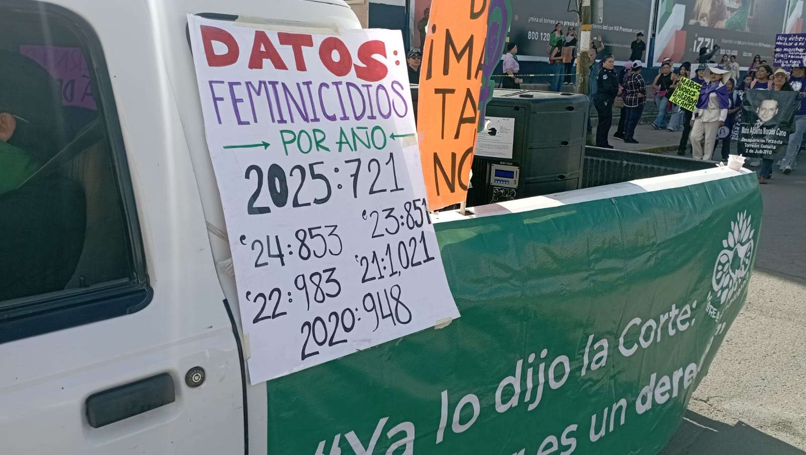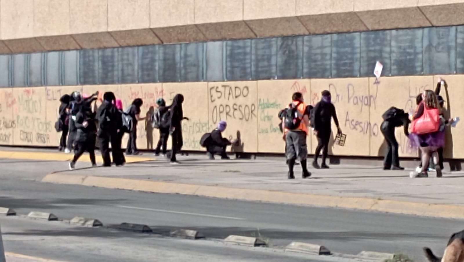 Chihuahua, Chih.- Integrantes del bloque negro realizaron actos de vandalismo e intervenciones en inmuebles de la avenida Universidad durante la marcha del 8M. El contingente aprovechó las fachadas de la ruta para realizar denuncias públicas contra funcionarios y figuras políticas, cubriendo muros con nombres y reclamos de justicia.