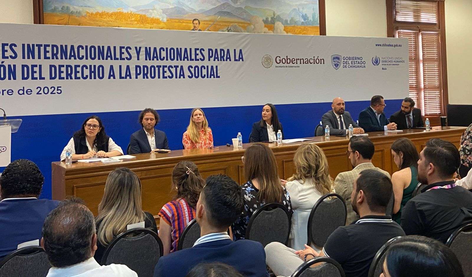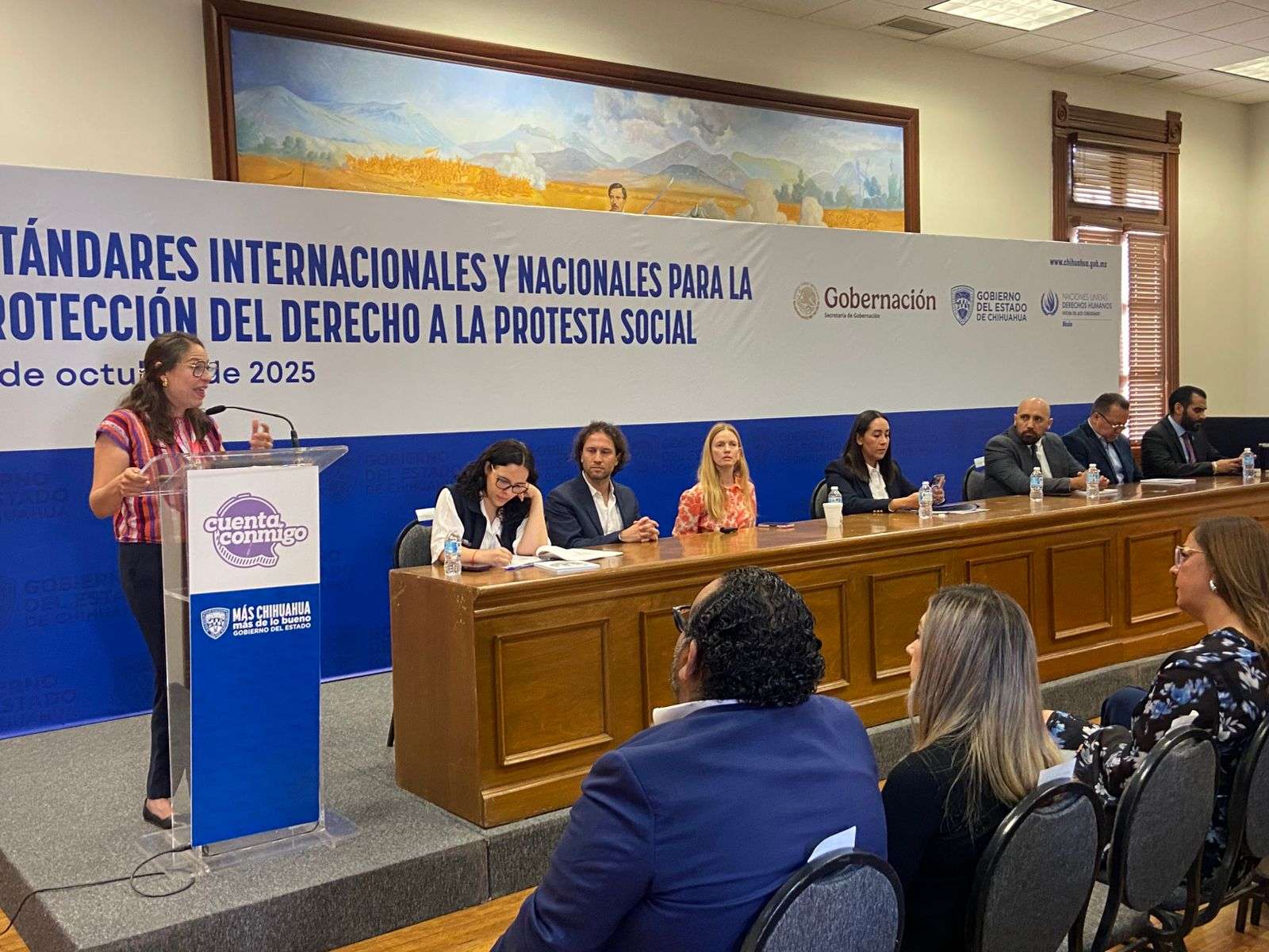 Chihuahua.- En el salón Sacramento de Palacio de Gobierno se llevó a cabo la presentación del foro Estándares Internacionales y Nacionales para la Protección del Derecho a la Protesta Civil, donde se realizaron una serie de ponencias.