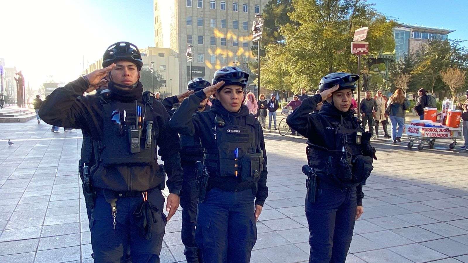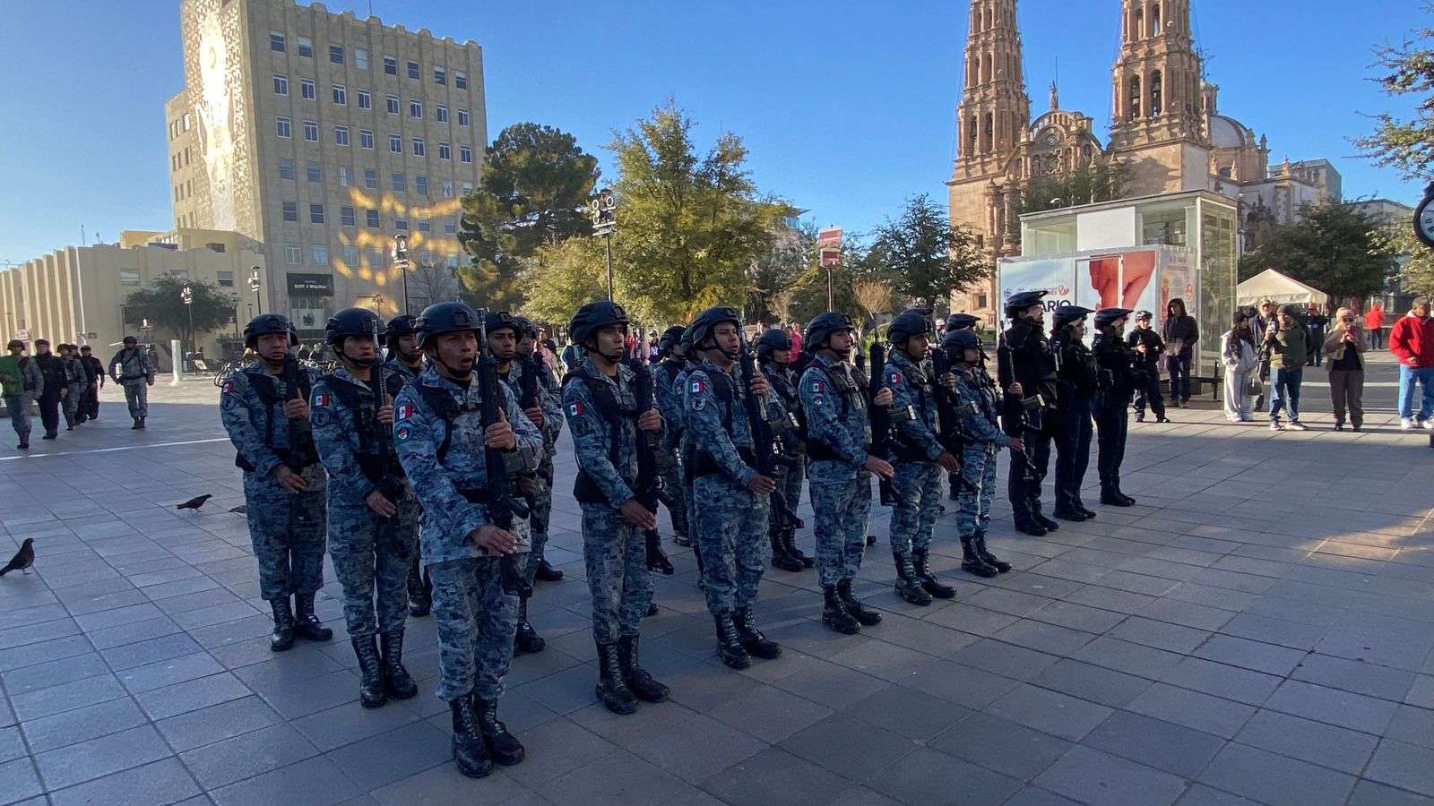 Chihuahua.– La Dirección de Seguridad Pública Municipal, en coordinación con la Guardia Nacional, realizó el izamiento de la bandera como acto protocolario durante el denominado Lunes Cívico, en la Plaza de Armas.