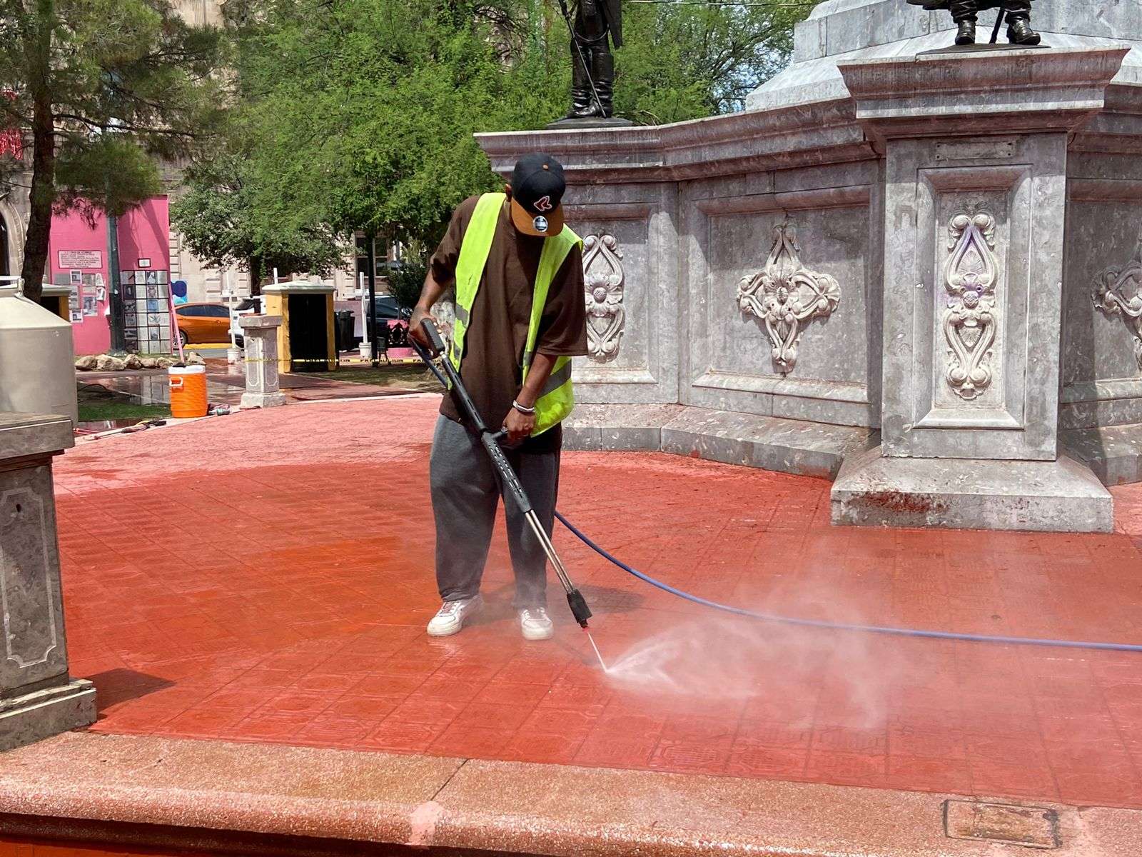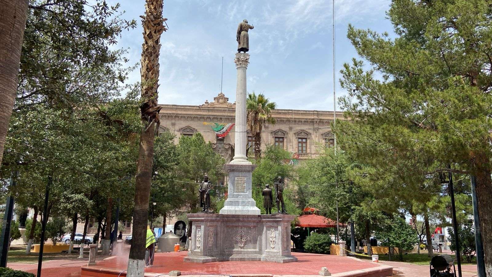 Chihuahua.- Trabajadores del municipio realizaron la limpieza de la Plaza Hidalgo, pintaron los pilares, limpiaron las bancas, todo en el marco de los festejos del 15 de septiembre, Día de la Independencia de México.