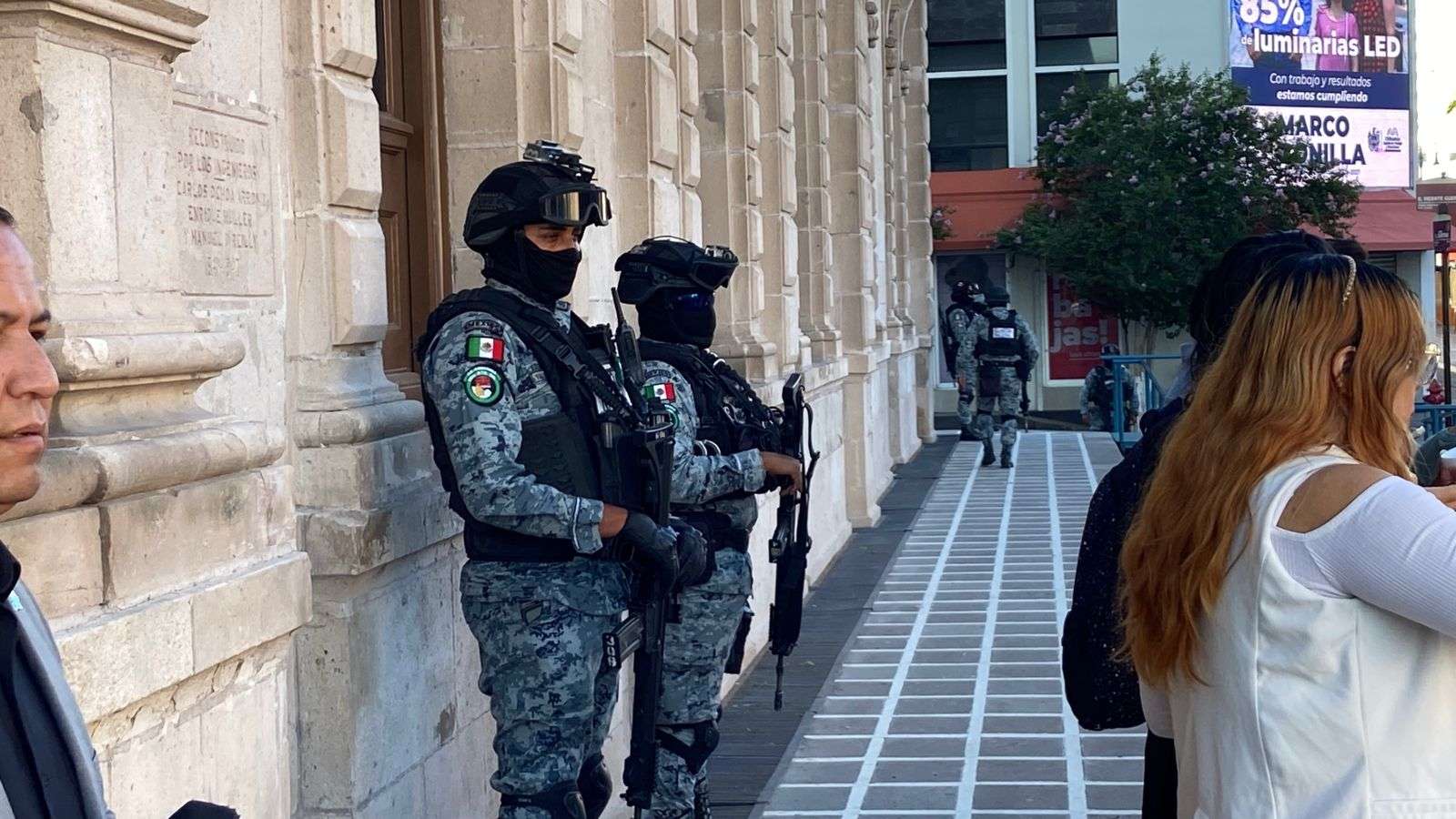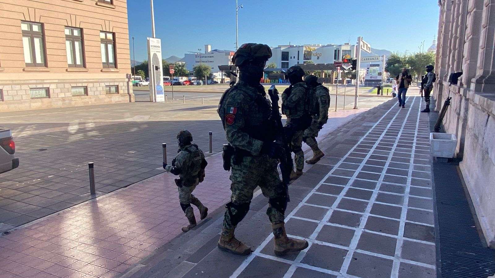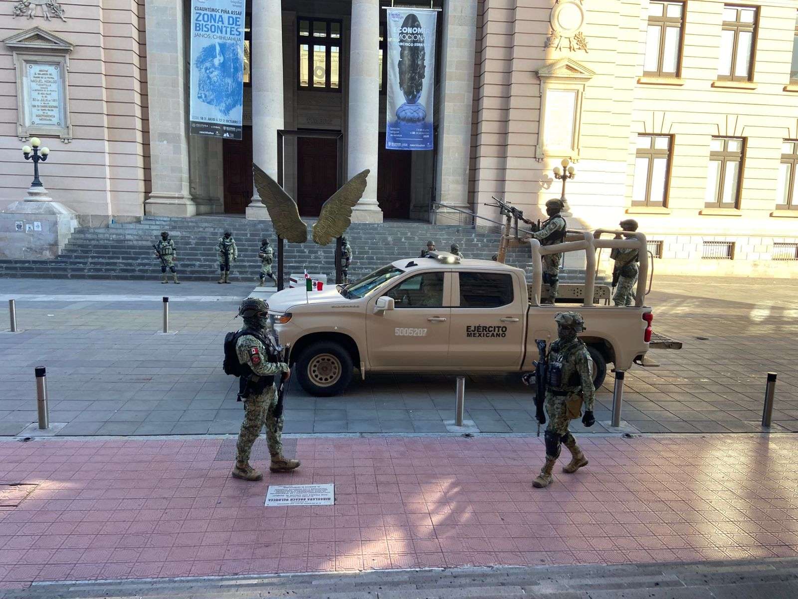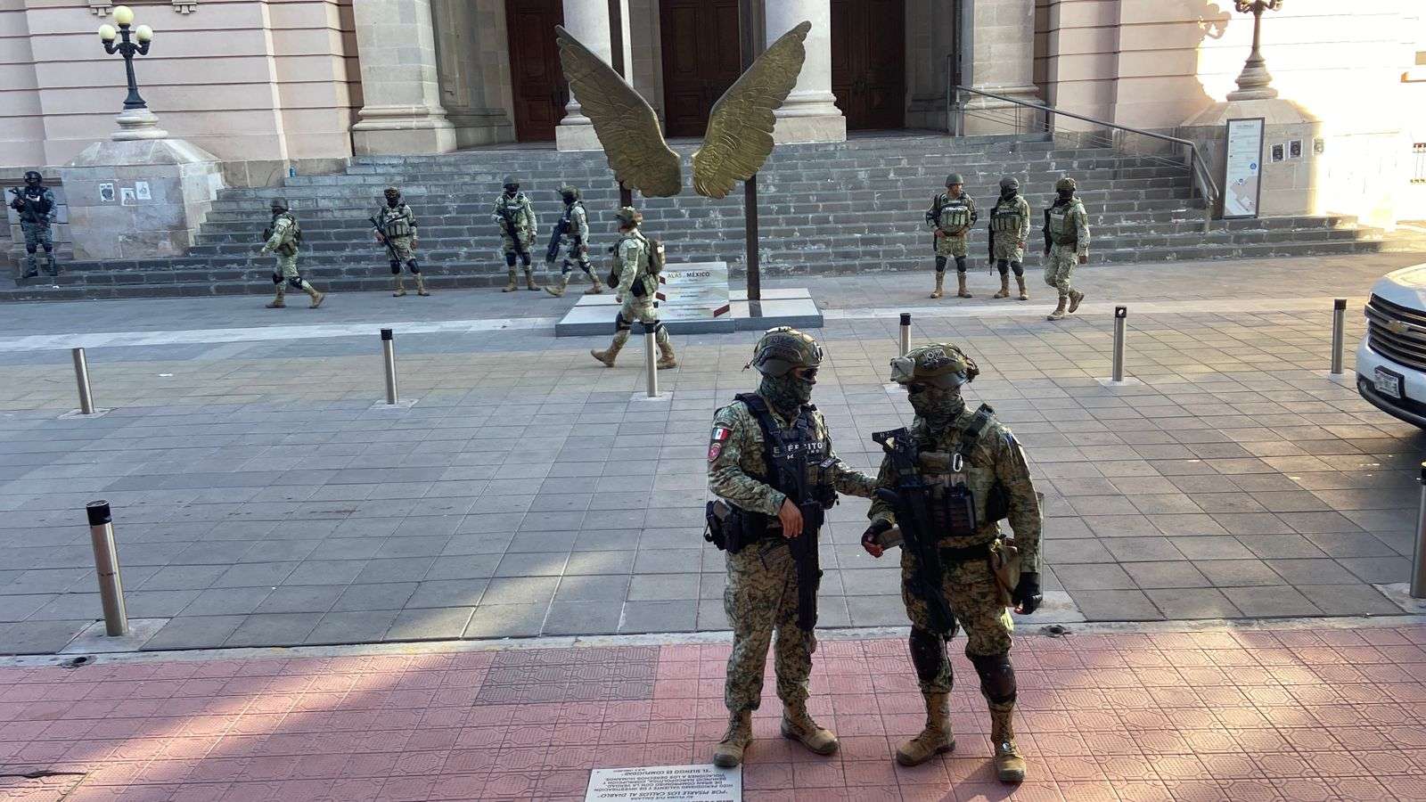 Al Palacio de Gobierno arribaron elementos de la Secretaría de la Defensa Nacional, de la Guardia Nacional, de la Secretaría de Seguridad Pública Estatal y de la Fiscalía General del Estado.