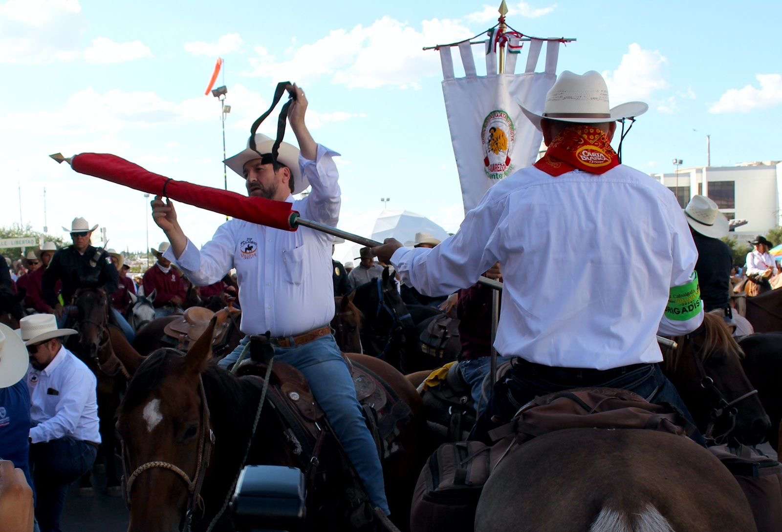 Previo al arranque del desfile, Edibray Gómez Gallegos, secretario de Turismo, en representación de la gobernadora Maru Campos, realizó el abanderamiento, al entregarle el lábaro patrio a José Miguel Salcido Romero, coordinador general de la Gran Cabalgata Villista.