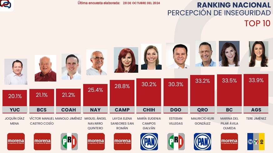 En términos de seguridad, Chihuahua también muestra avances significativos, ya que la administración de Campos se sitúa entre las entidades con menor percepción de inseguridad, con un 30.2%.