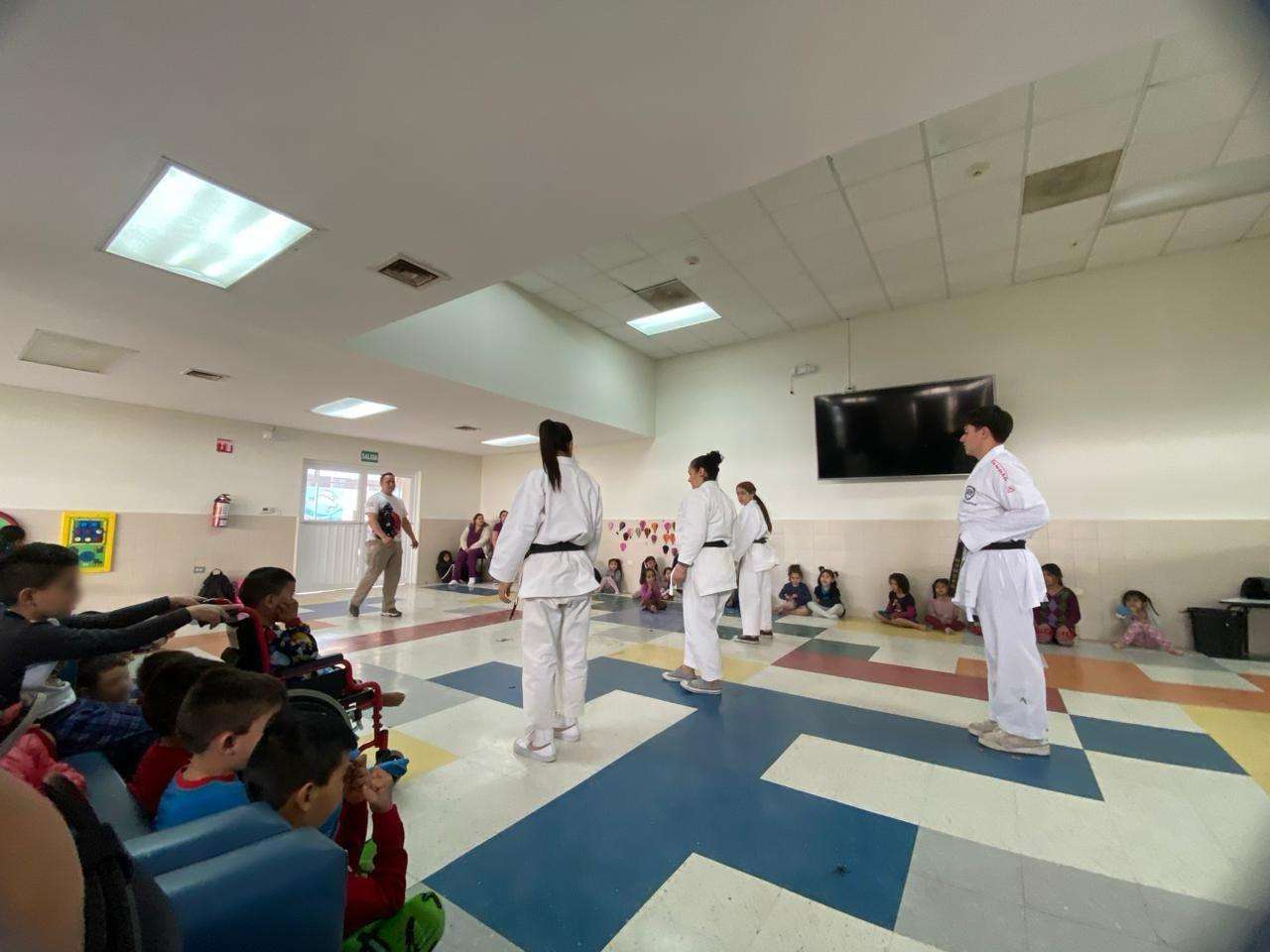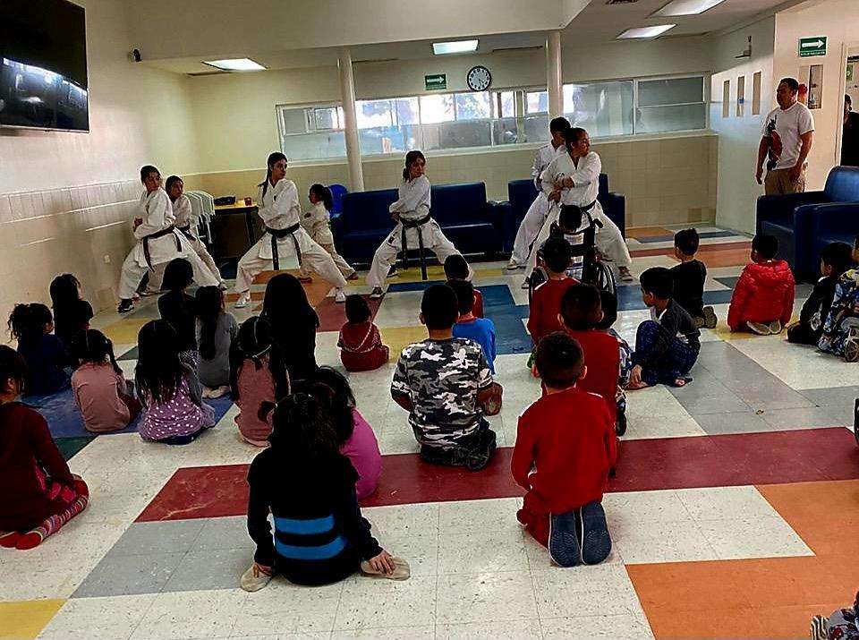Chihuahua.- En apoyo y atención al derecho humano de las niñas y niños que viven en la Casa Cuna del DIF Estatal, de disfrutar de actividades que impulsen su sano esparcimiento, las y los infantes de dicho espacio reciben clases de Karate, a fin de motivarles el amor por el deporte y la disciplina.