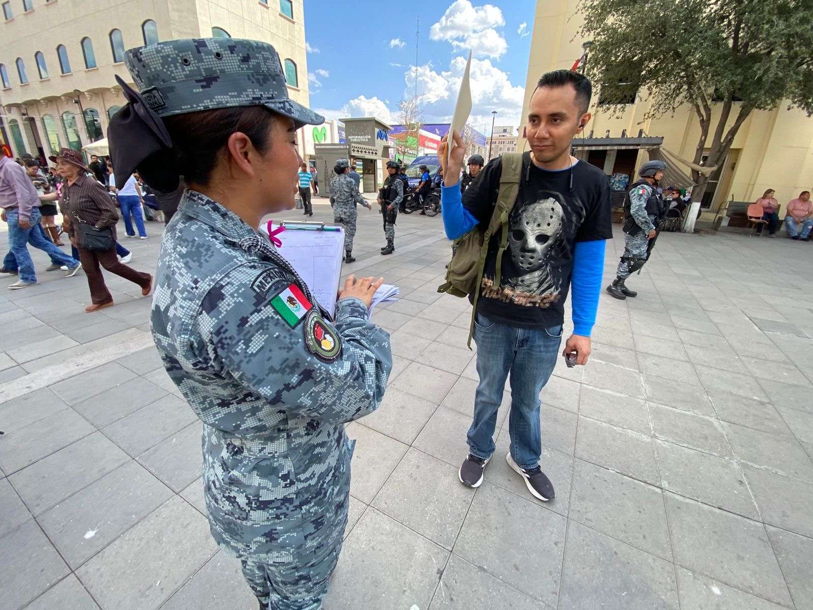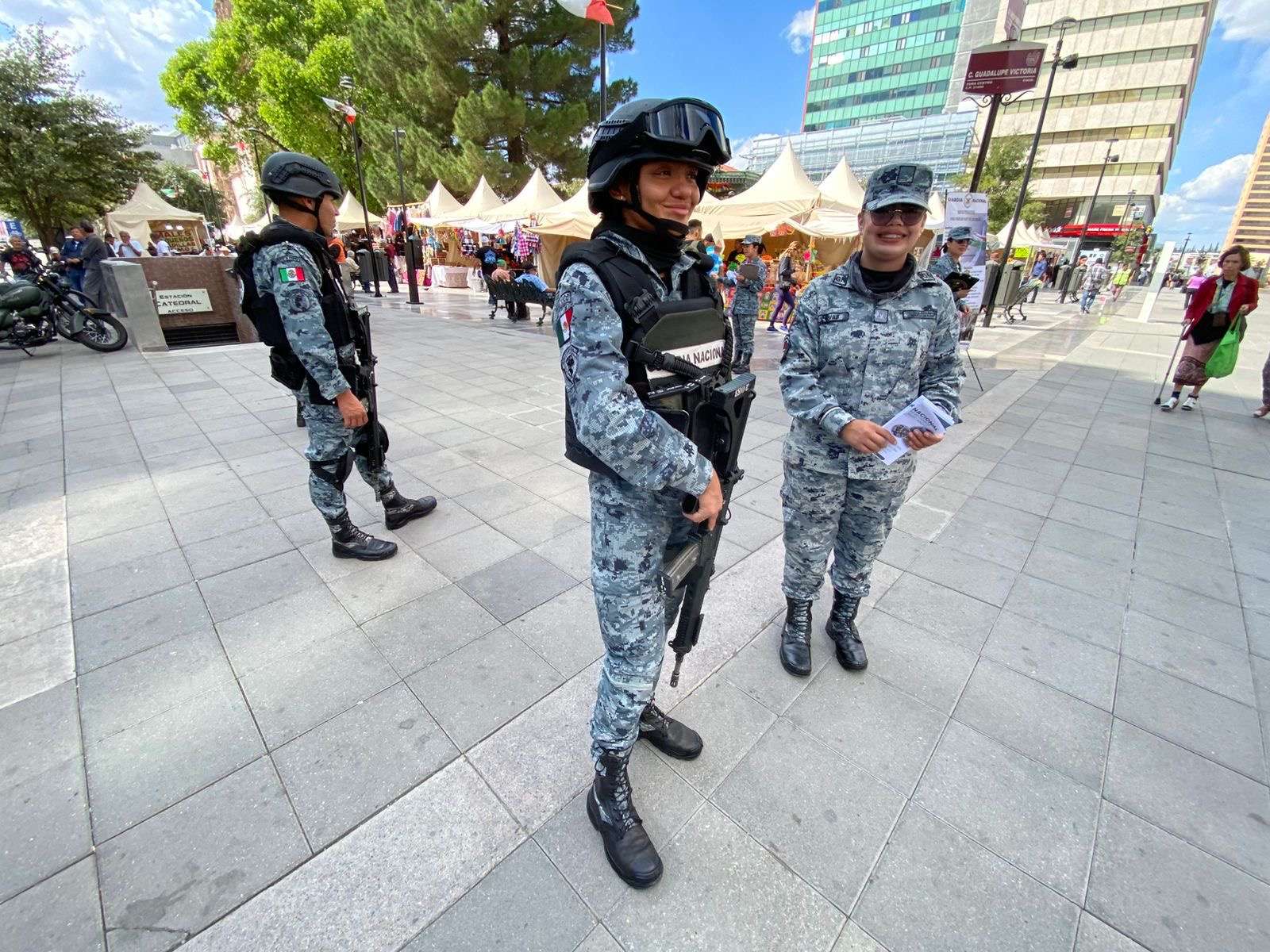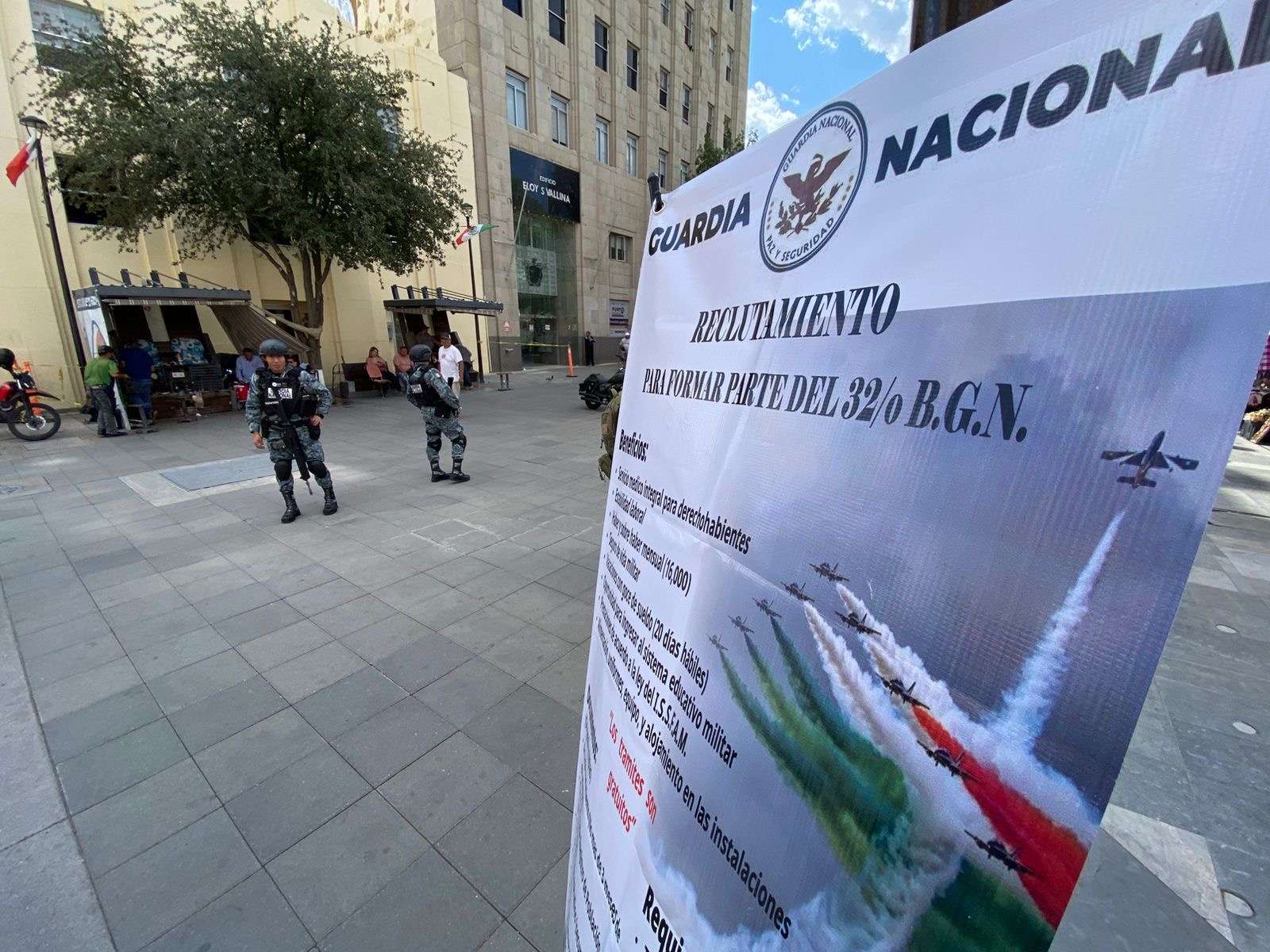 Chihuahua.- En la Victoria e Independencia en el centro se encuentran elementos de la Guardia Nacional quienes se encuentran invitando a formar parte del 32/o batallón de la Guardia Nacional.