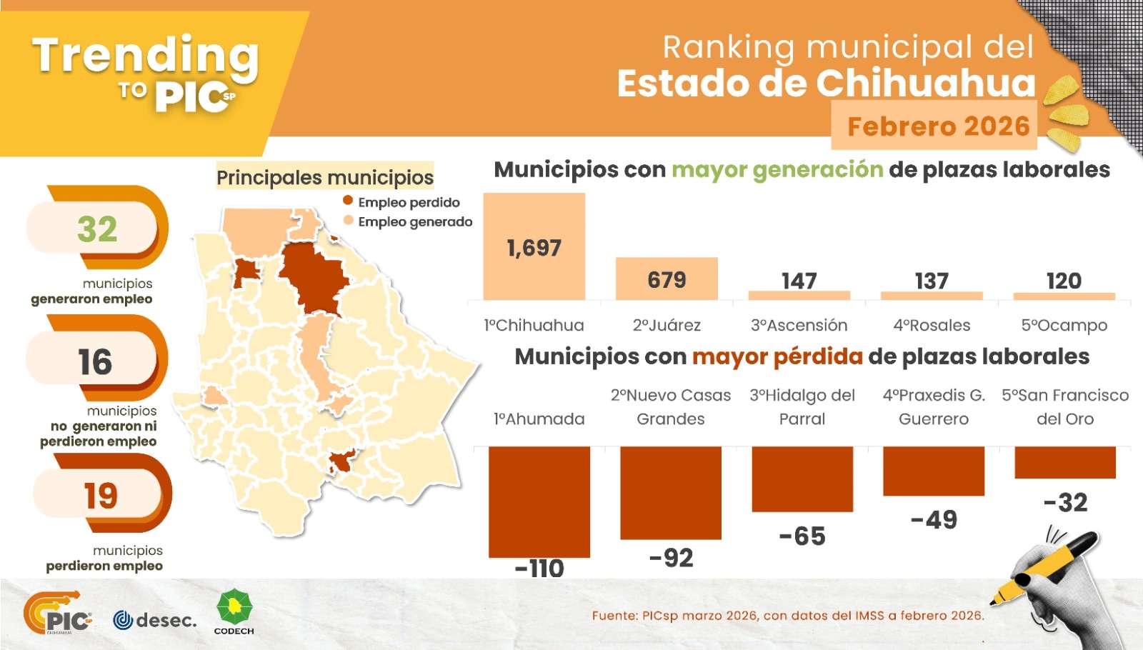 En contraste, los municipios que registraron mayores pérdidas de empleo en el mismo periodo fueron Ahumada con -163, Jiménez con -161 y Parral con -115 puestos de trabajo.