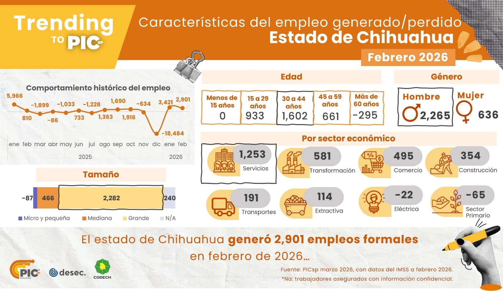 Chihuahua.- Durante febrero de 2026 se generaron 2 mil 901 plazas laborales en el estado de Chihuahua, mientras que en el acumulado de enero a febrero la cifra alcanza 6 mil 322 empleos.