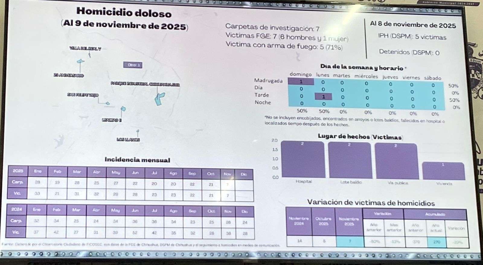 Chihuahua.- El Comisario de la Policía Municipal, Julio César Salas González, informó que en los primeros once días de noviembre se han registrado nueve homicidios en la capital, cifra que refleja la persistencia de hechos violentos en la ciudad.
