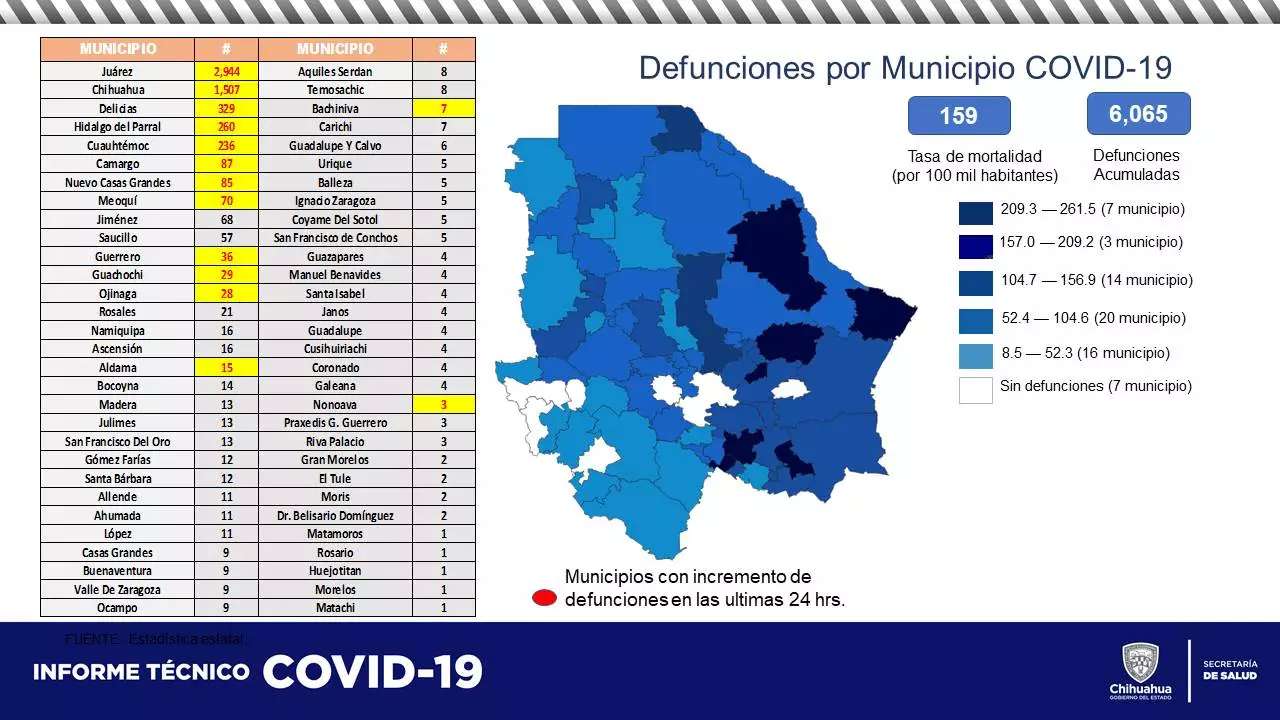 Decesos acumulados por municipio: 2,944 Ciudad Juárez, 1,507 Chihuahua, 329 Delicias, 260 Parral, 236 Cuauhtémoc, 87 Camargo, 85 Nuevo Casas Grandes, 70 Meoqui, 68 Jiménez, 57 Saucillo, 36 Guerrero, 29 Guachochi, 28 Ojinaga, 21 Rosales, 16 Ascensión, 16 Namiquipa, 14 Bocoyna, 15 Aldama, 13 San Francisco del Oro, 13 Madera, 13 Gómez Farías, 13 Julimes, 12 Santa Bárbara, 11 Ahumada, 11 Allende, 11 López, 9 Buenaventura, 9 Casas Grandes, 9 Valle de Zaragoza, 9 Ocampo, 8 Aquiles Serdán, 8 Temósachic, 7 Carichí, 6 Guadalupe y Calvo, 7 Bachíniva, 5 Urique, 5 Coyame del Sotol, 5 San Francisco de Conchos, 5 Balleza, 5 Ignacio Zaragoza, 4 Galeana, 4 Guadalupe D. B., 4 Janos, 4 Santa Isabel, 4 Cusihuiriachi, 4 Coronado, 4 Manuel Benavides, 3 Praxedis G. Guerrero, 3 Riva Palacio, 4 Guazapares. 2 Dr. Belisario Domínguez, 2 Moris, 3 Nonoava, 2 Gran Morelos, 2 El Tule, 1 Matachí, 1 Huejotitán, 1 Matamoros, 1 Morelos y 1 Rosario.