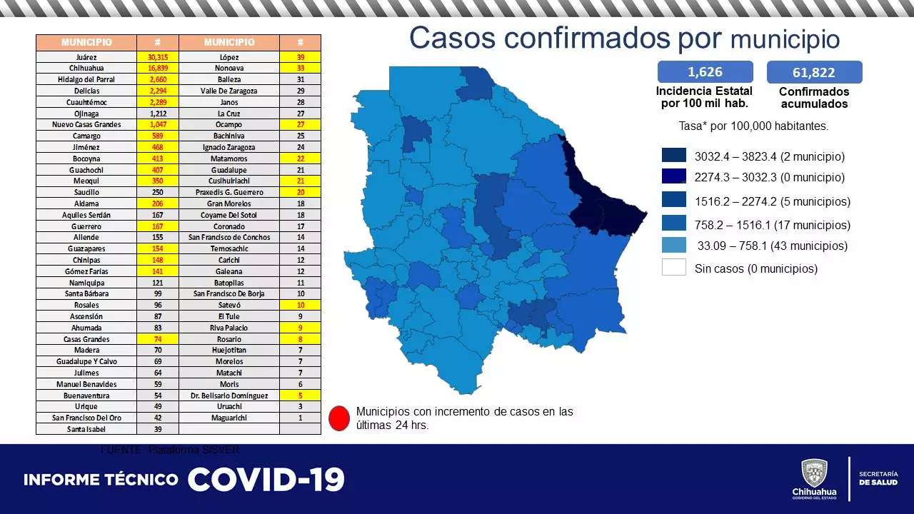 Contagios acumulados por municipio: 30,315 Juárez, 16,839 Chihuahua, 2,660 Hidalgo del Parral, 2,294 Delicias, 2,289 Cuauhtémoc, 1,212 Ojinaga, 1,047 Nuevo Casas Grandes, 589 Camargo, 468 Jiménez, 407 Guachochi, 413 Bocoyna, 350 Meoqui, 250 Saucillo, 206 Aldama, 167 Aquiles Serdán, 167 Guerrero, 155 Allende,148 Chínipas, 154 Guazapares, 141 Gómez Farías, 121 Namiquipa, 96 Rosales, 99 Santa Bárbara, 87 Ascensión, 84 Ahumada, 74 Casas Grandes, 69 Guadalupe y Calvo, 70 Madera, 58 Manuel Benavides, 64 Julimes, 54 Buenaventura, 49 Urique, 42 San Francisco del Oro, 39 Santa Isabel, 39 López, 33 Nonoava, 28 Janos, 27 La Cruz, 29 Valle De Zaragoza, 27 Ocampo, 31 Balleza, 25 Bachíniva, 24 Ignacio Zaragoza, 22 Matamoros, 21 Guadalupe, 21 Cusihuiriachi, 20 Praxedis G. Guerrero, 18 Gran Morelos, 17 Coronado, 18 Coyame del Sotol, 14 San Francisco de Conchos, 14 Temósachic, 12 Carichí, 10 San Francisco de Borja, 12 Galeana, 9 El Tule, 11 Batopilas, 7 Huejotitán, 7 Morelos, 6 Moris, 9 Riva Palacio, 8 Rosario, 10 Satevó, 5 Dr. Belisario Domínguez, 3 Uruachi, 7 Matachí y 1 Maguarichi.