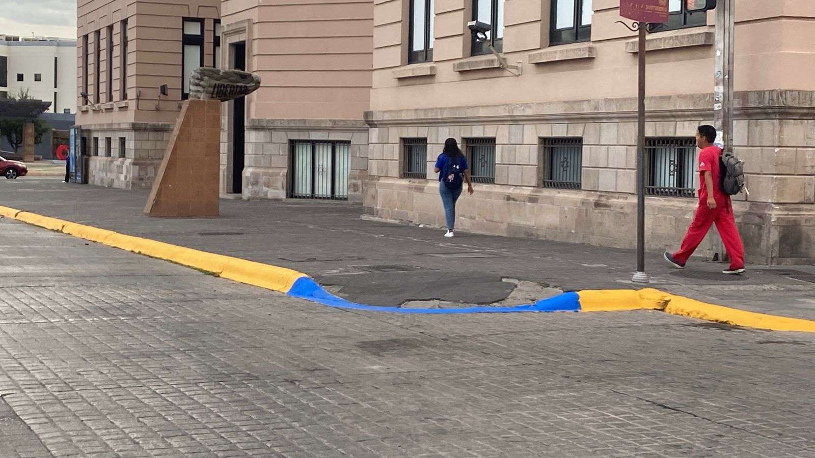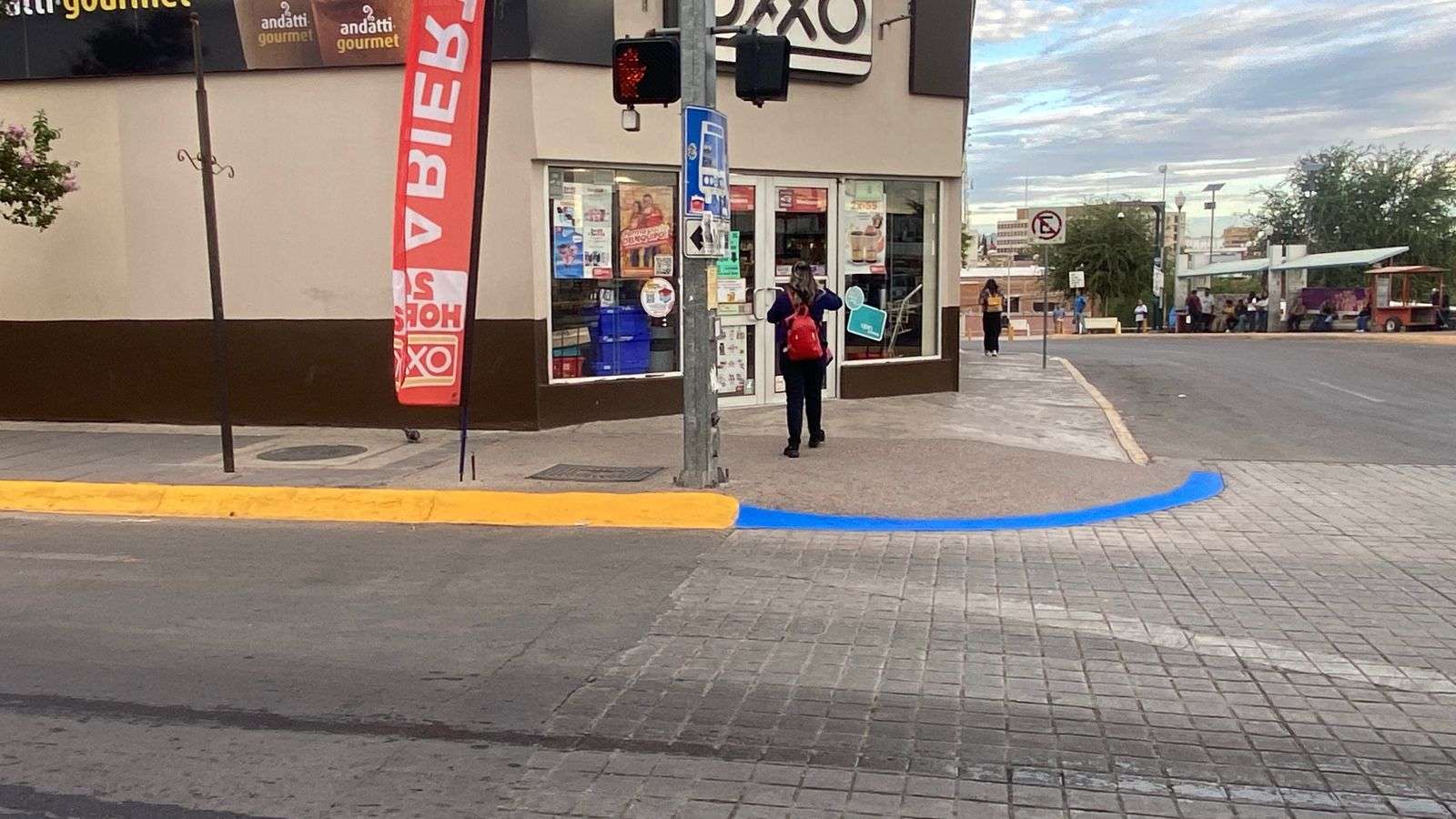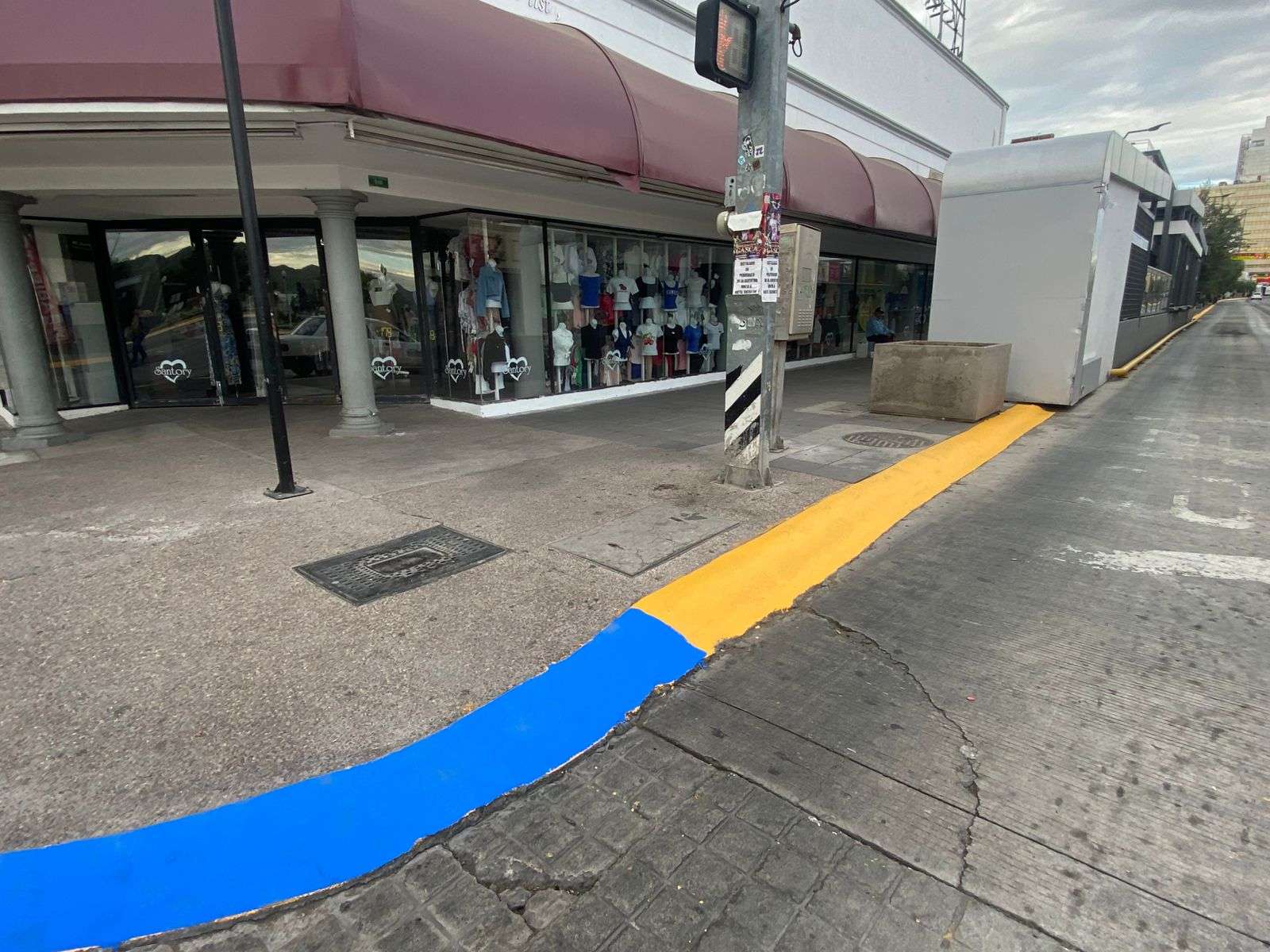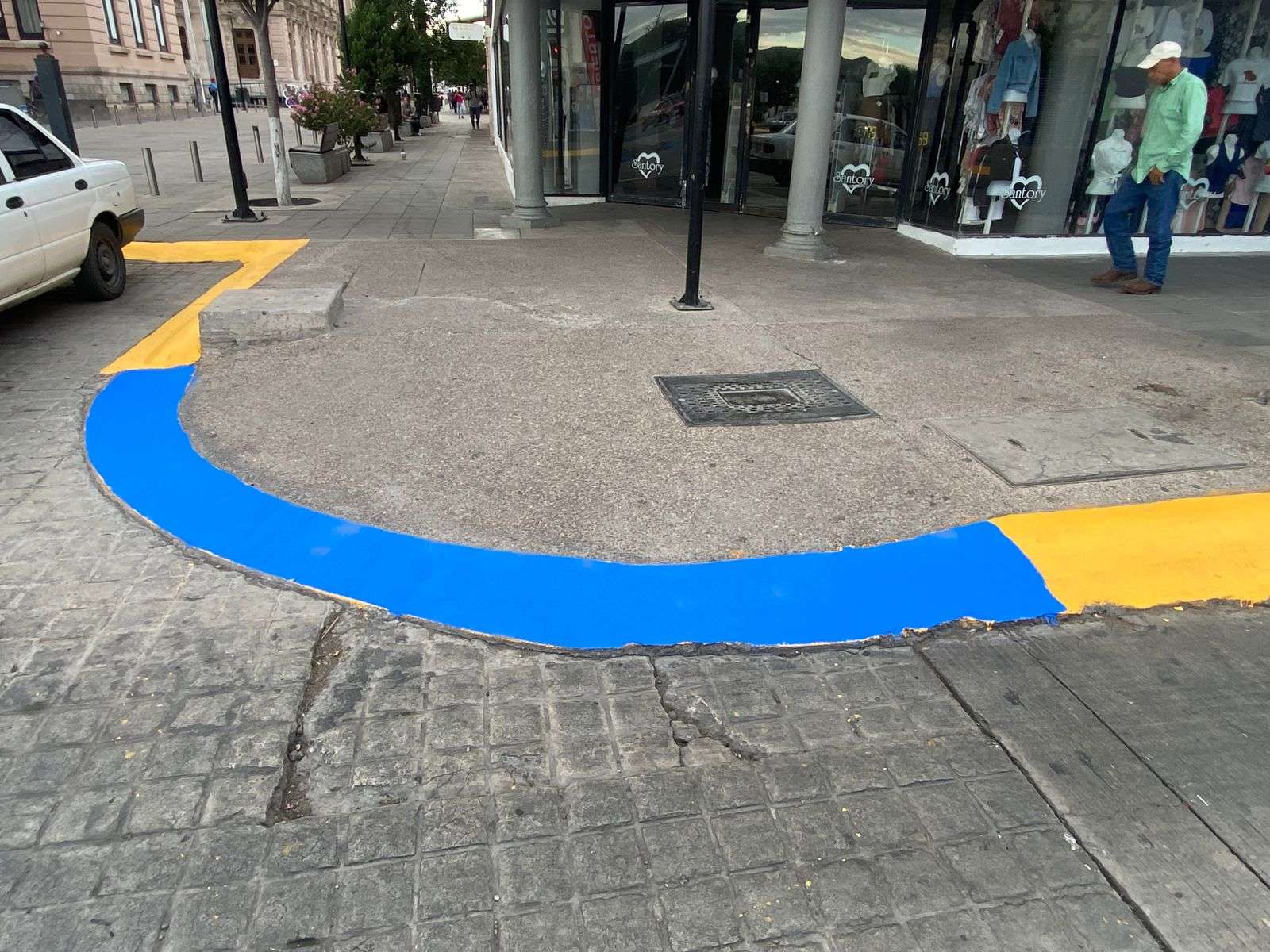 Chihuahua.– Las guarniciones de las banquetas en la colonia Centro de la ciudad amanecieron pintadas como parte de una acción para mejorar la seguridad de los peatones y promover el respeto a los espacios destinados a personas con discapacidad.