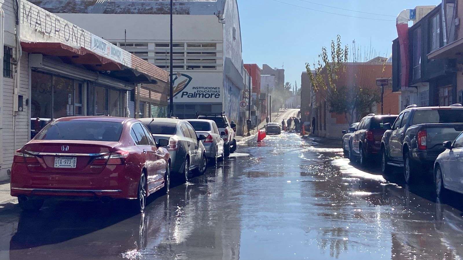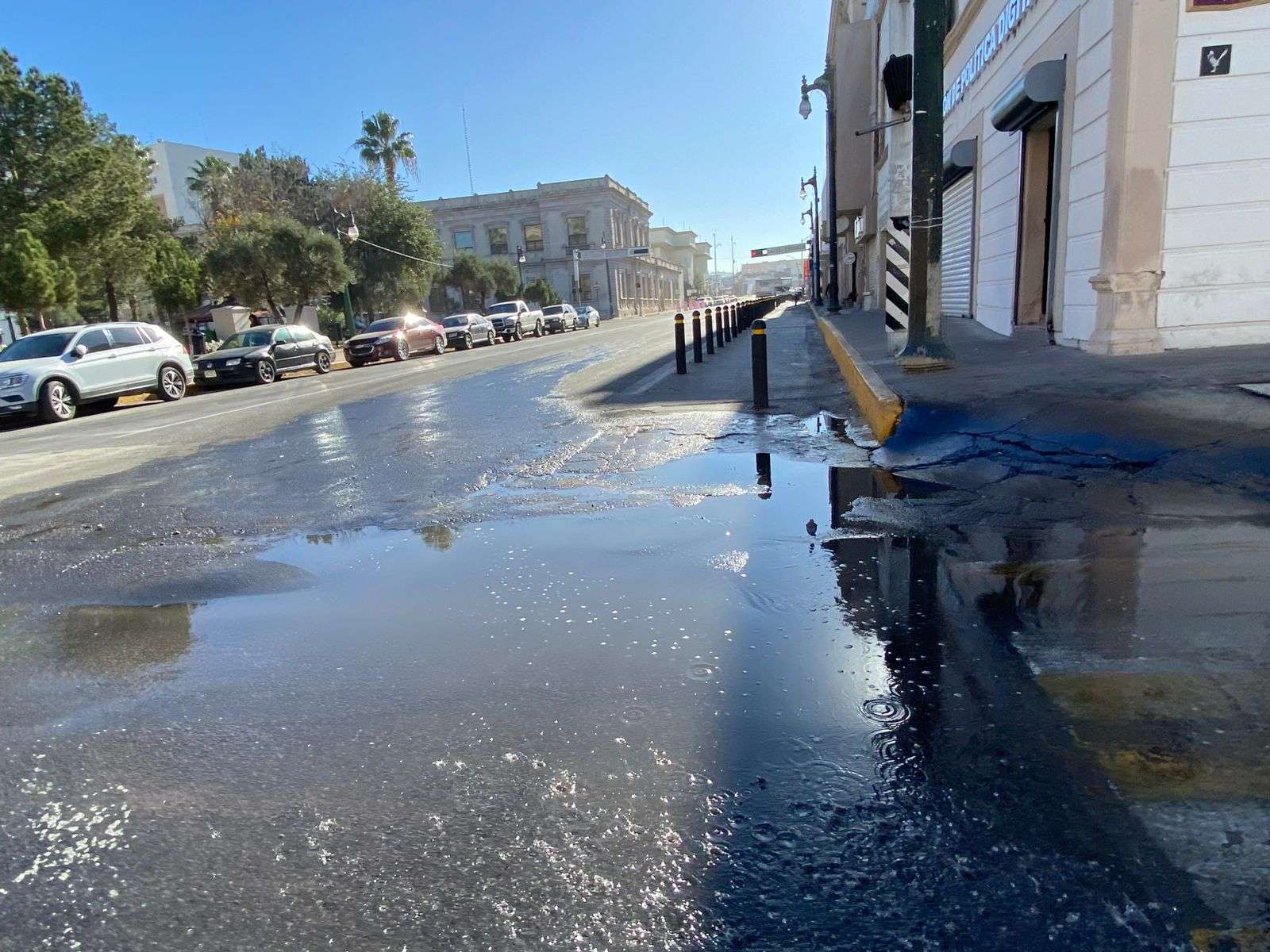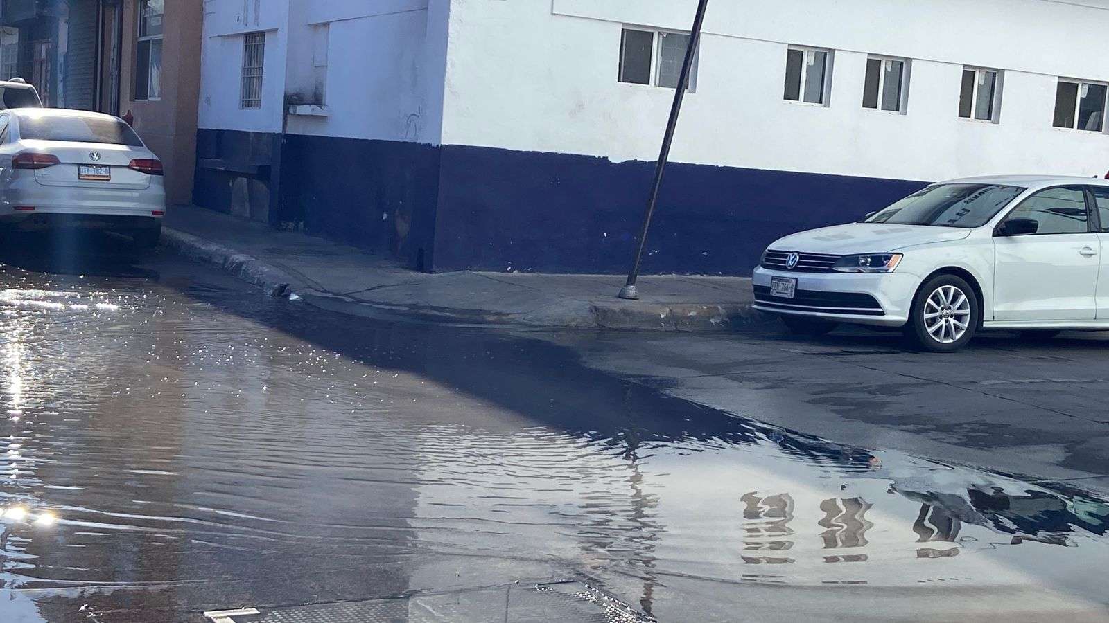 La magnitud de la fuga fue tal que el agua alcanzó la calle Aldama, donde se acumuló y comenzó a escurrir por las alcantarillas ubicadas cerca del Palacio de Gobierno, generando preocupación entre peatones y comerciantes de la zona.