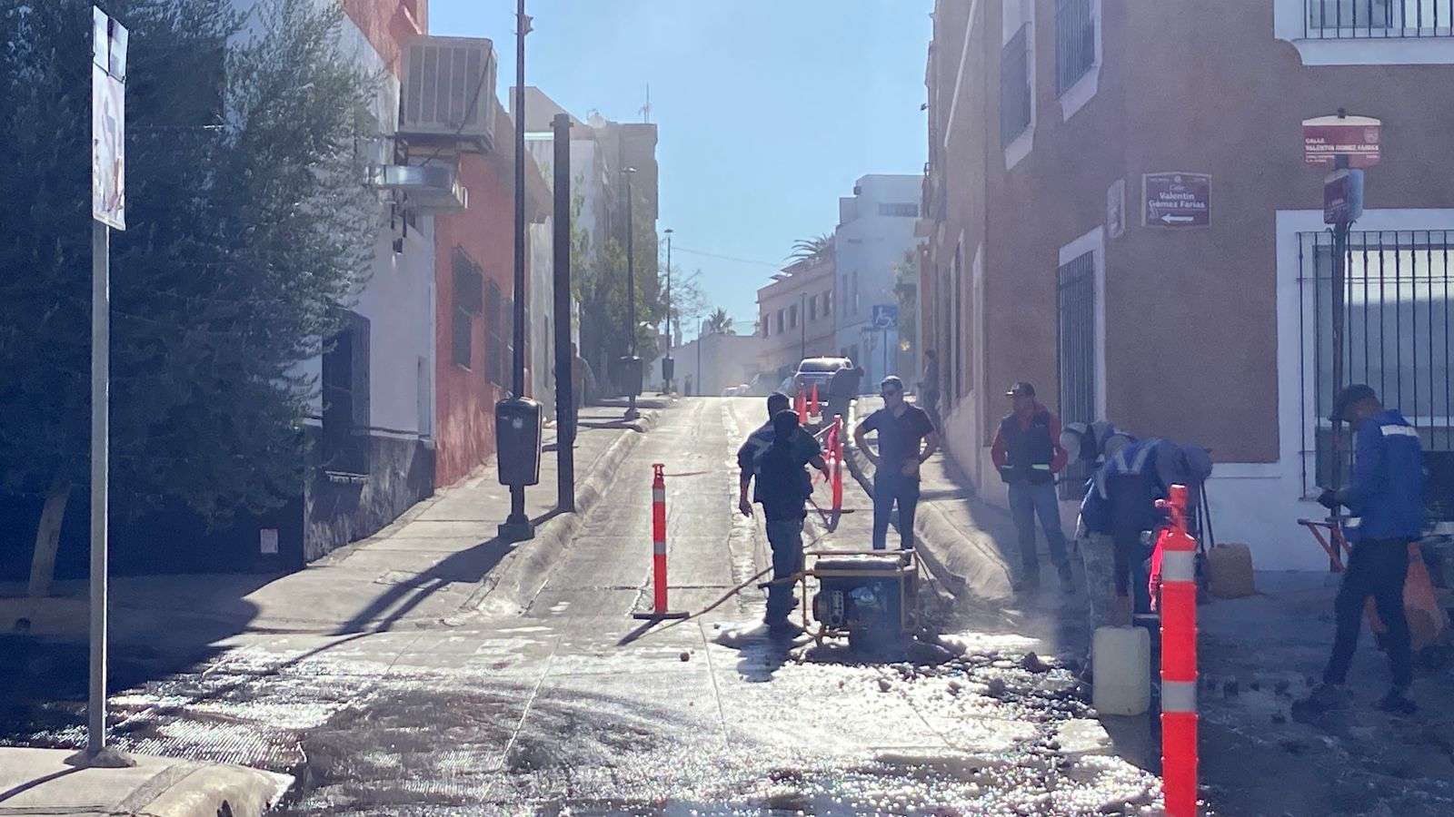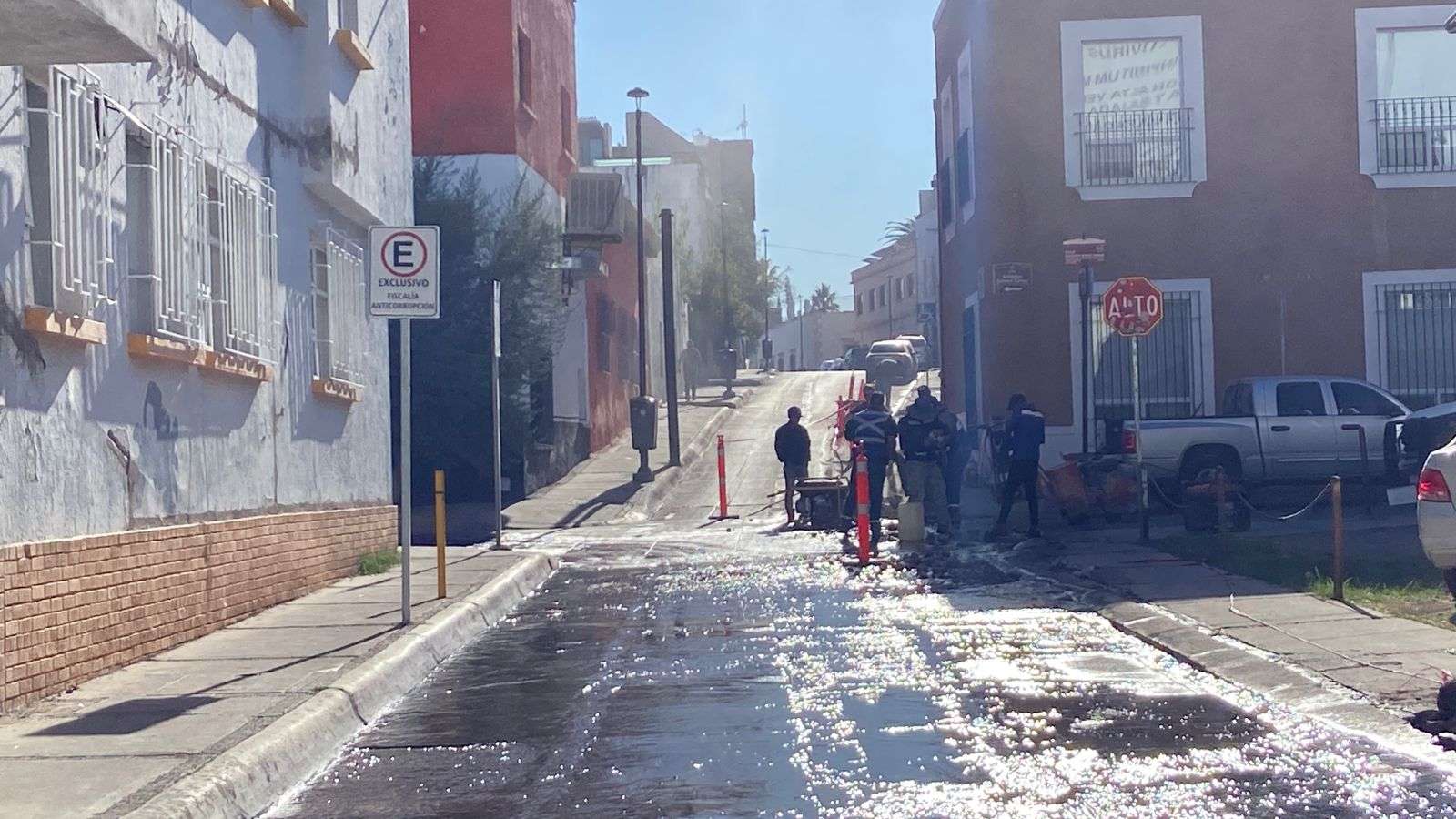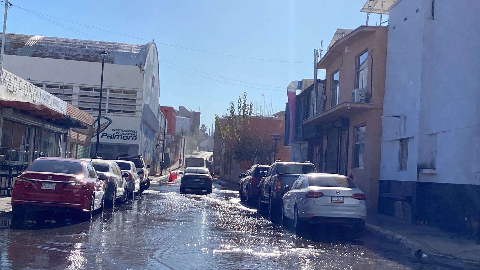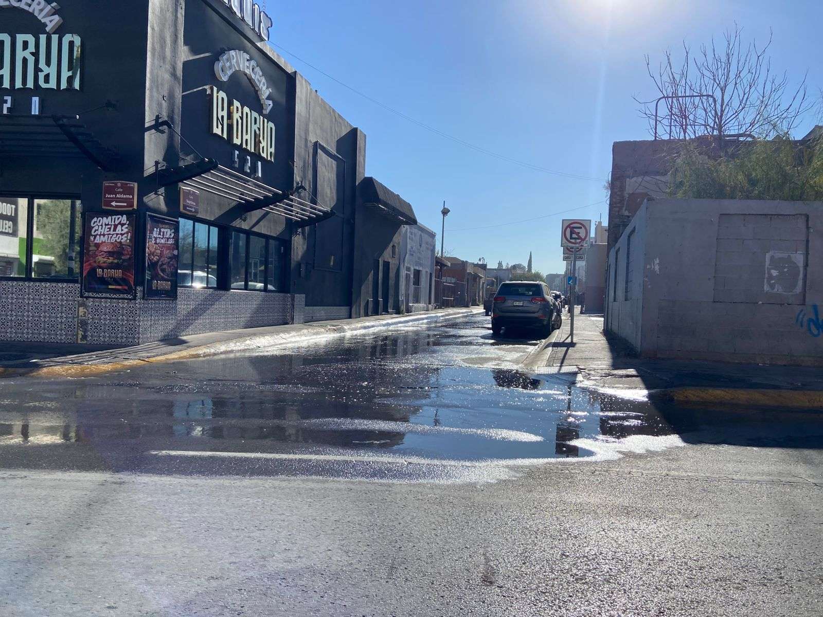 La magnitud de la fuga fue tal que el agua alcanzó la calle Aldama, donde se acumuló y comenzó a escurrir por las alcantarillas ubicadas cerca del Palacio de Gobierno, generando preocupación entre peatones y comerciantes de la zona.