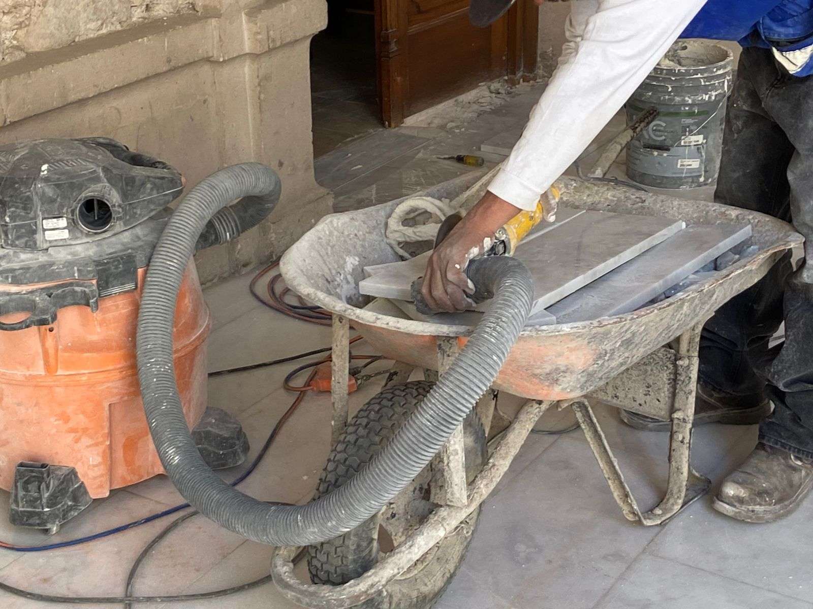 Apoyado con una pulidora para cortar el mármol a la medida y un rotomartillo para retirar el material desgastado con mayor facilidad, realizó las labores de renovación.