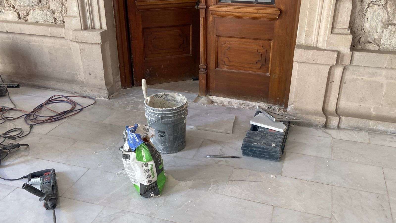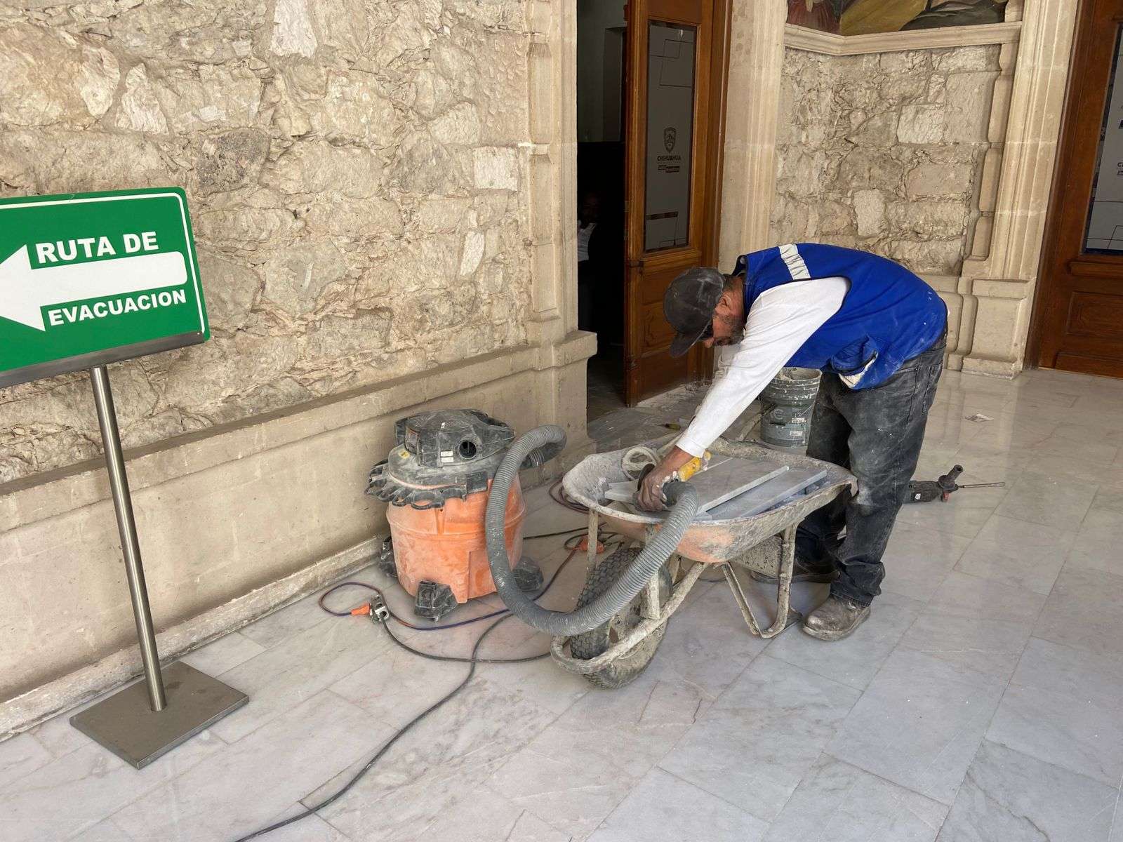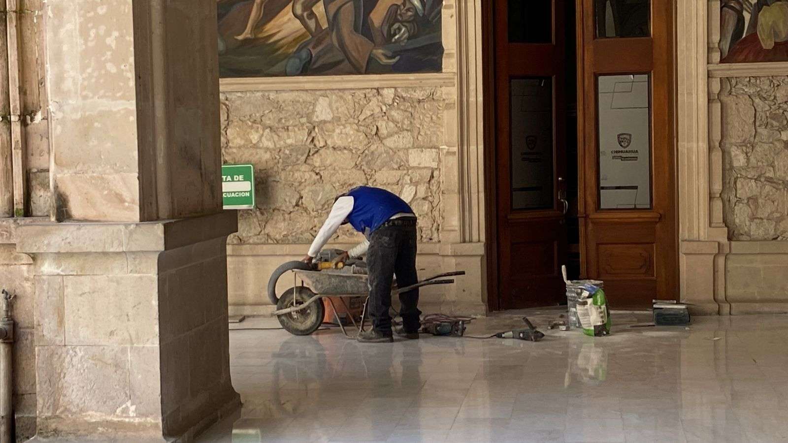 Chihuahua.- En el Palacio de Gobierno, durante estos días de asueto, se aprovecharon las jornadas para reparar las losetas de mármol que se encontraban deterioradas.