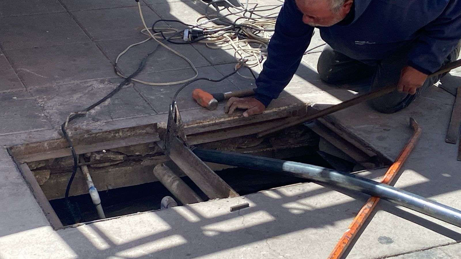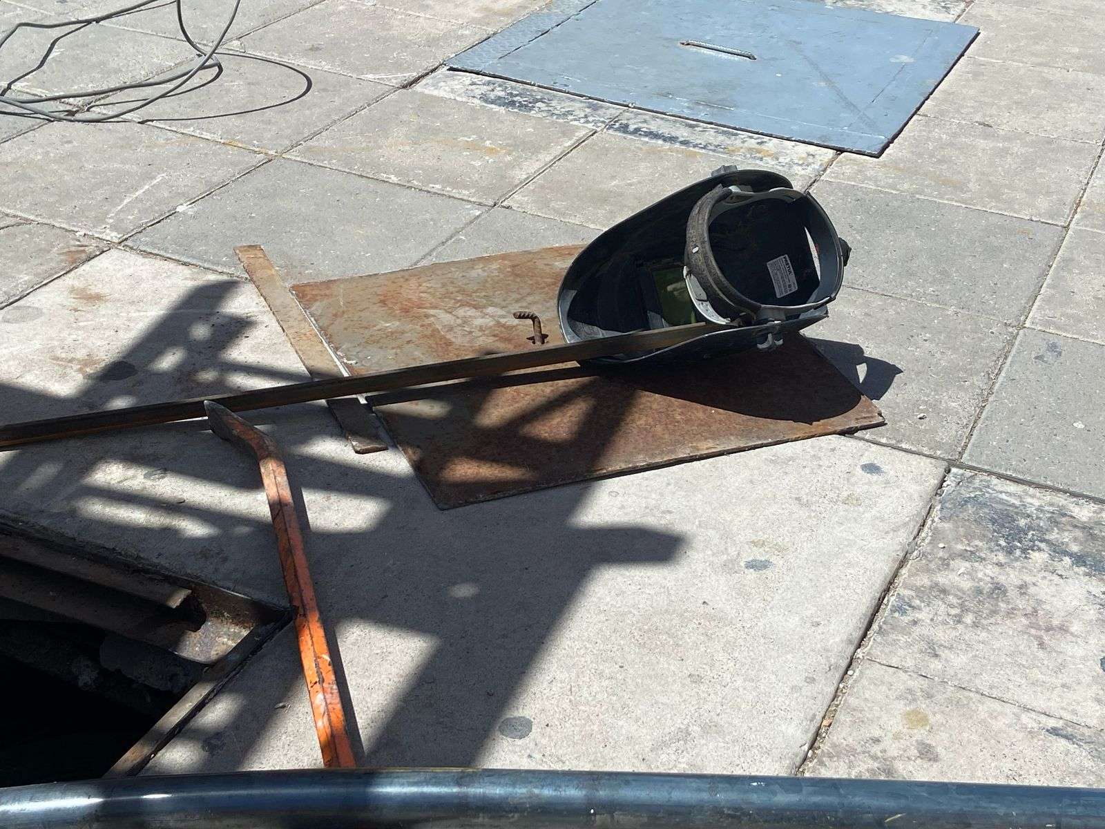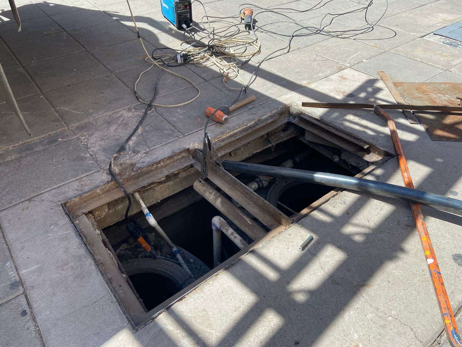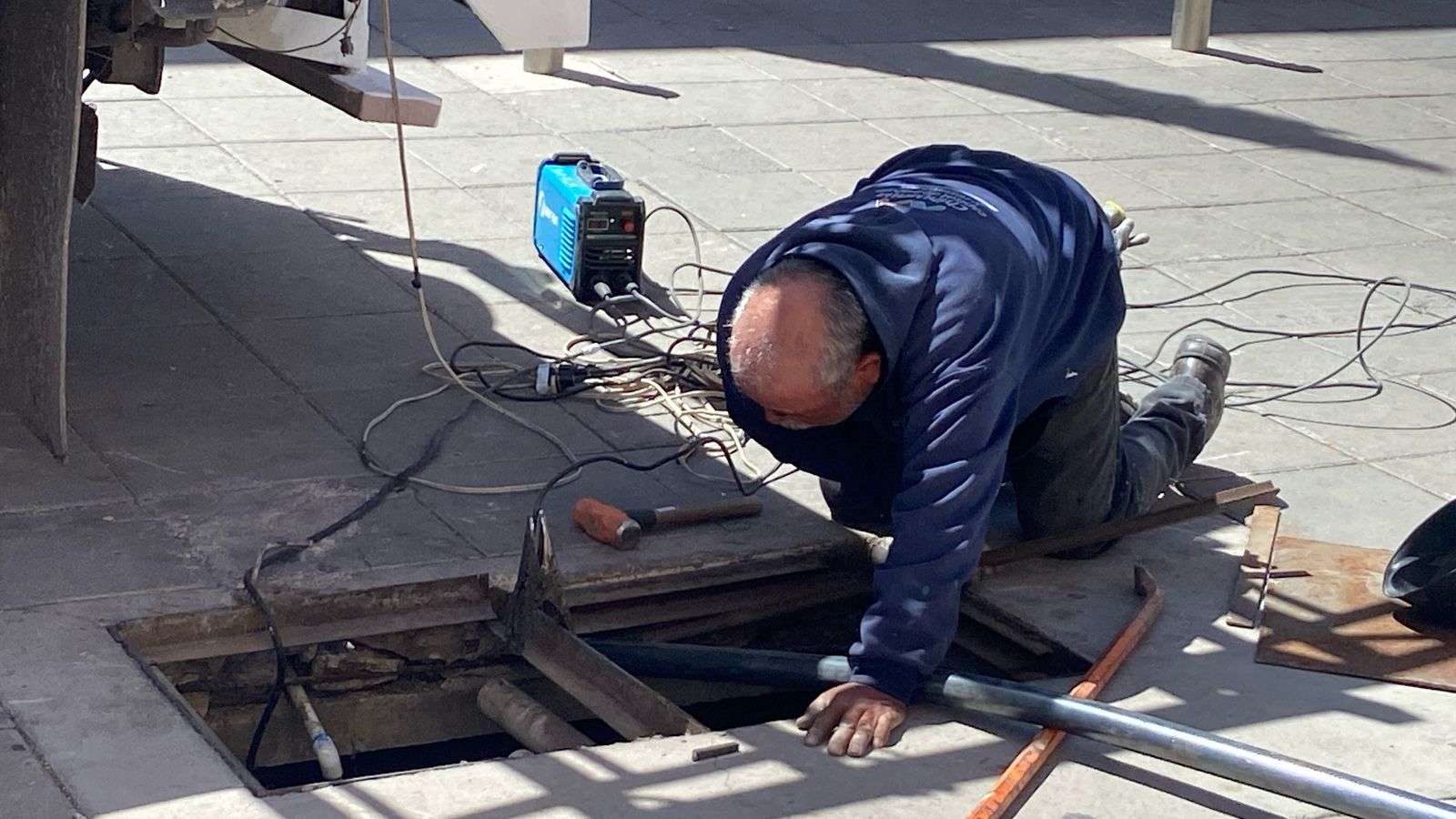 Actualmente, el equipo se encuentra en el lugar utilizando una máquina soldadora, un taladro, una planta de luz y la herramienta necesaria para completar la reparación de la tapa del registro.