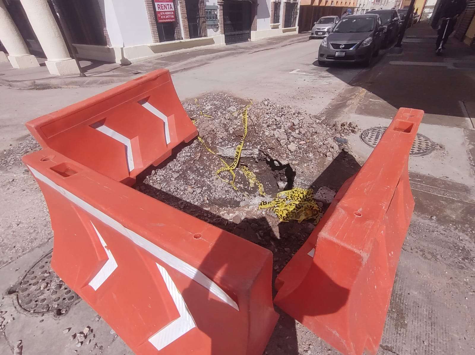 La afectación ha generado complicaciones viales, principalmente sobre la calle Quinta, donde los conductores se ven obligados a disminuir la velocidad y maniobrar para esquivar las vallas de contención colocadas alrededor del socavón.