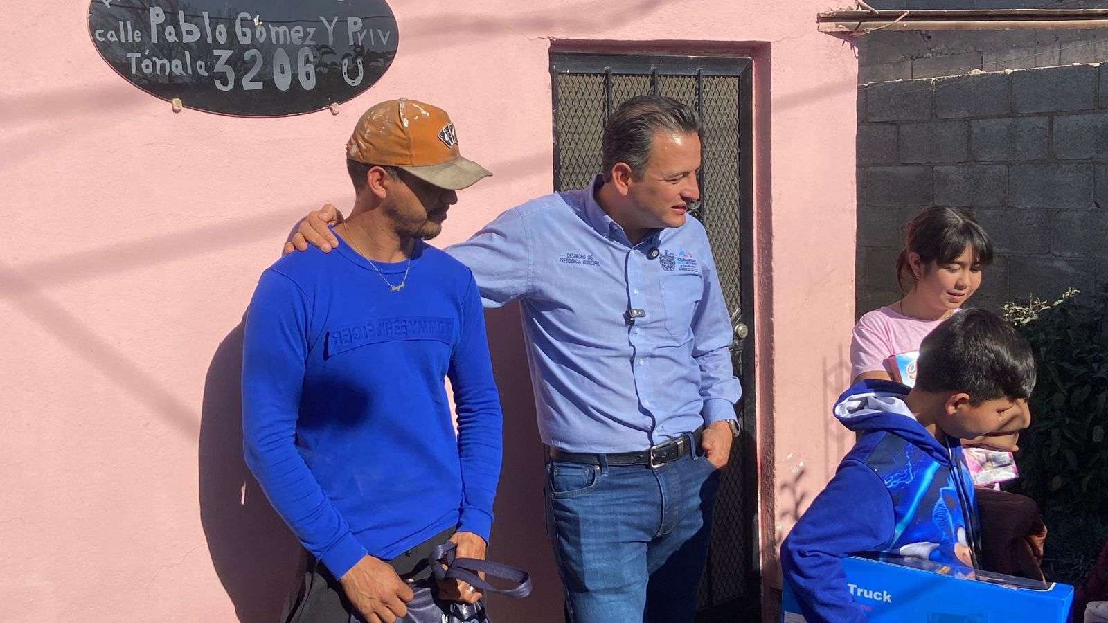 Chihuahua.- El alcalde Marco Antonio Bonilla Mendoza y la presidenta del DIF Municipal, Karina Olivas, encabezaron la entrega de cenas navideñas, chamarras y apoyos funcionales a vecinos de la colonia Crucero, ubicada al sur de la ciudad.