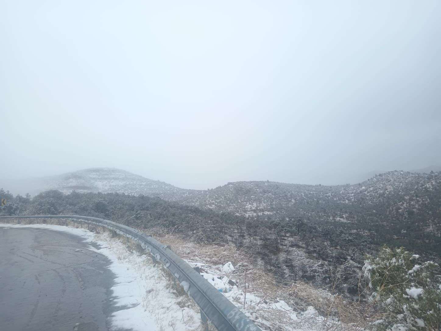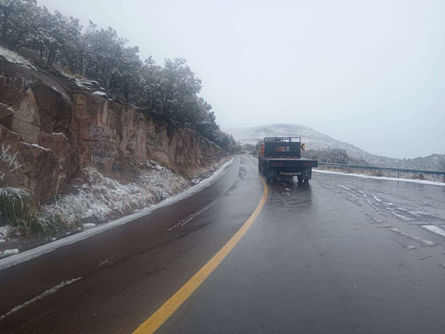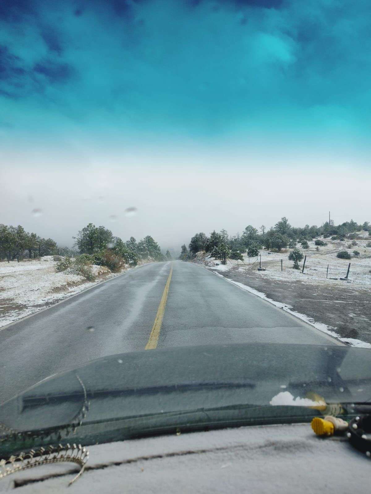 En Gómez Farías se presentó nieve ligera, sin embargo, el tramo Gómez Farías–Namiquipa, en la zona conocida como La Cuesta del Toro, sigue abierto a la circulación.