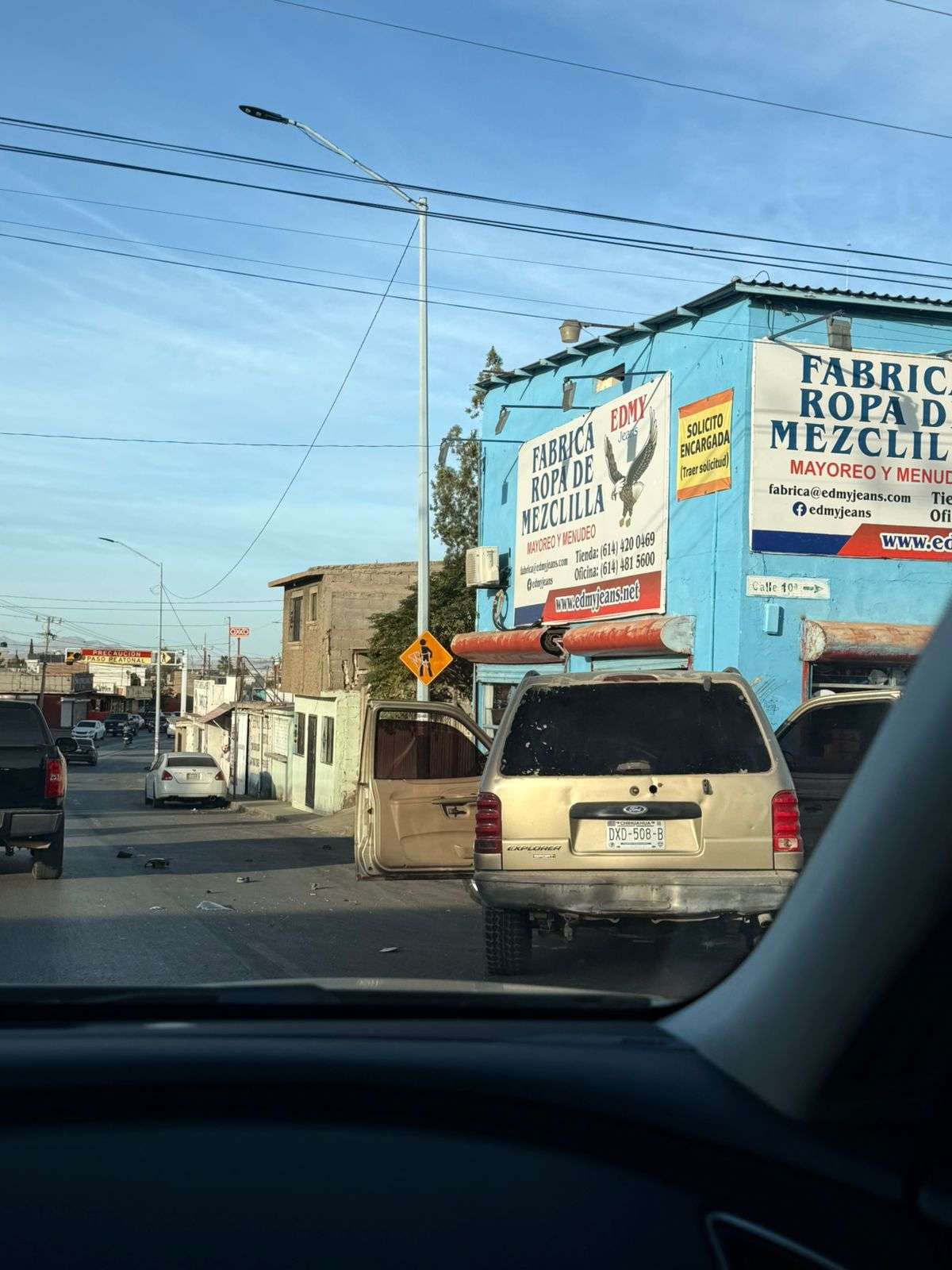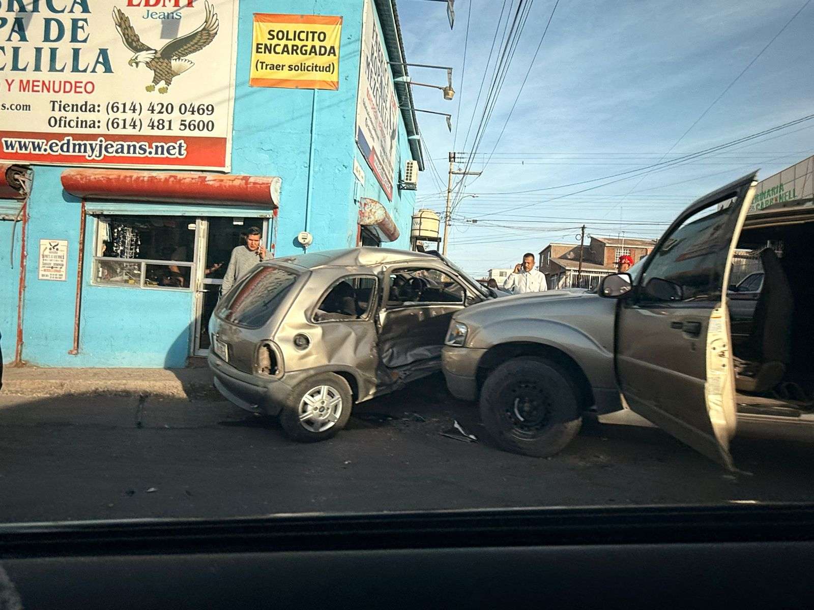 Chihuahua.- Un fuerte choque entre dos vehículos se registró esta tarde en el cruce de las calles Nueva España y Décima, justo en la esquina de una fábrica de mezclilla.