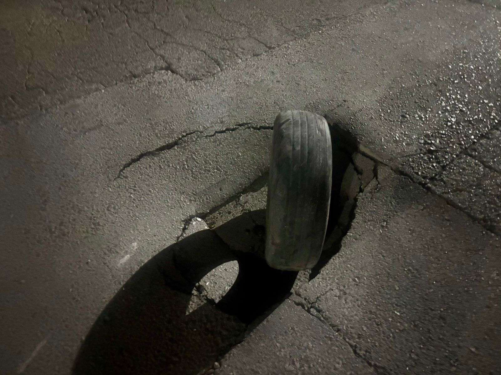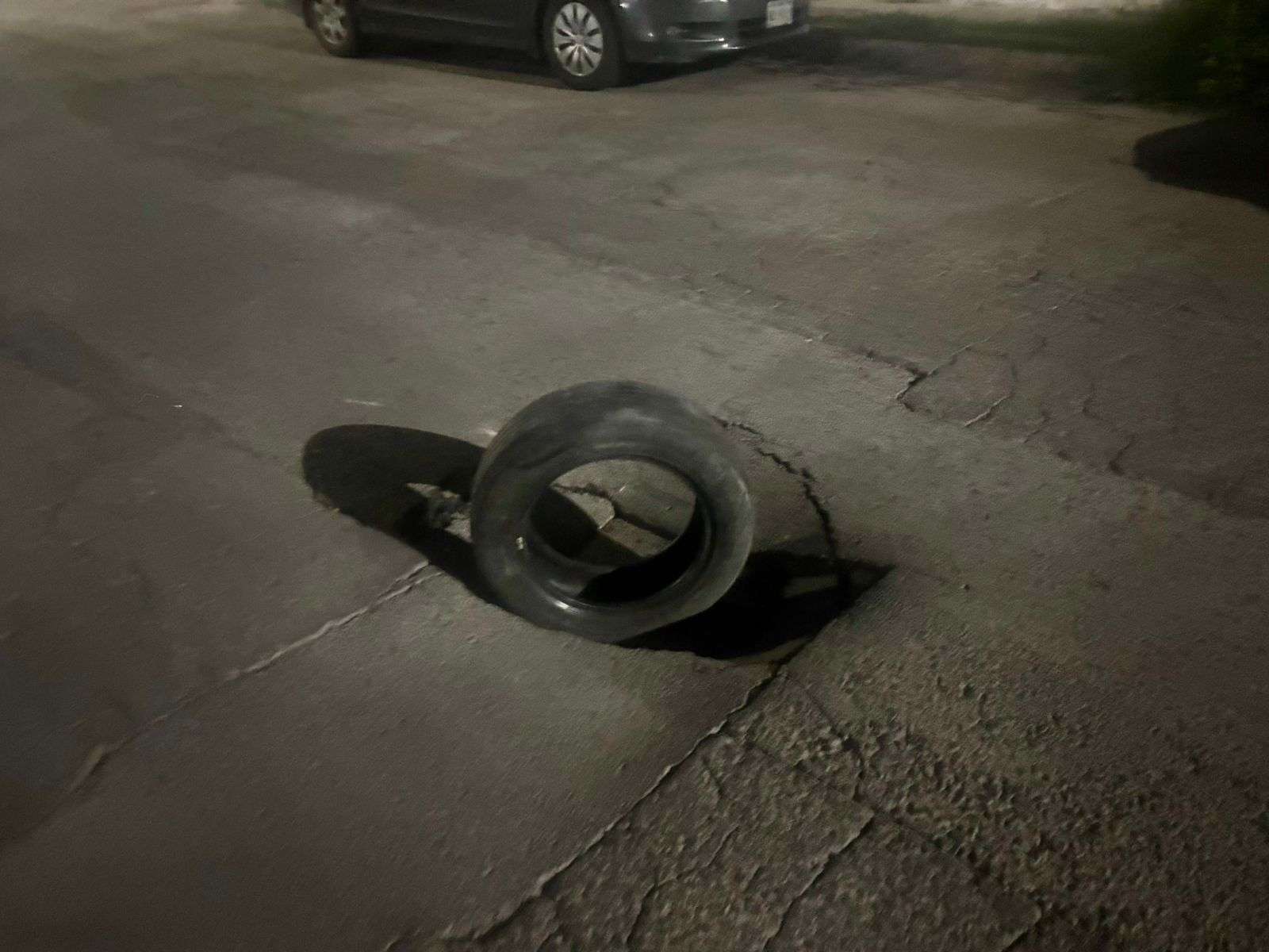 Los habitantes tuvieron que colocar un neumático para advertir el peligro que este socavón representa tanto para peatones, como conductores.
