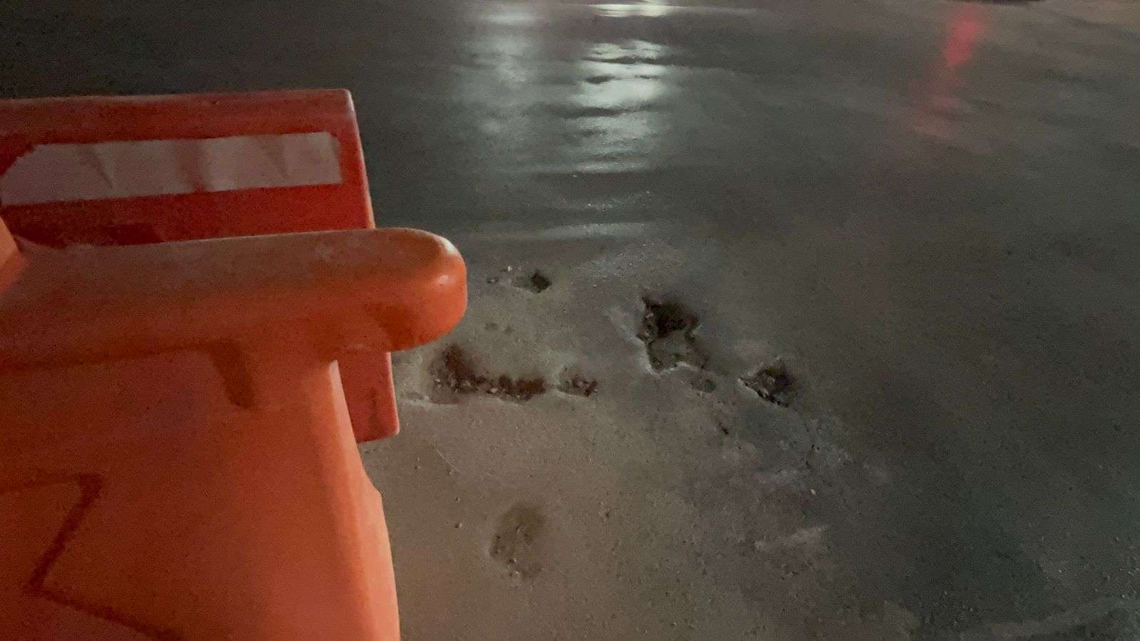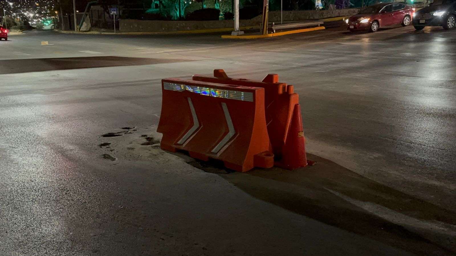 Para alertar sobre esta falla en el pavimento, fueron colocadas dos barreras de señalización con el fin de evitar que algún vehículo caiga en el lugar.