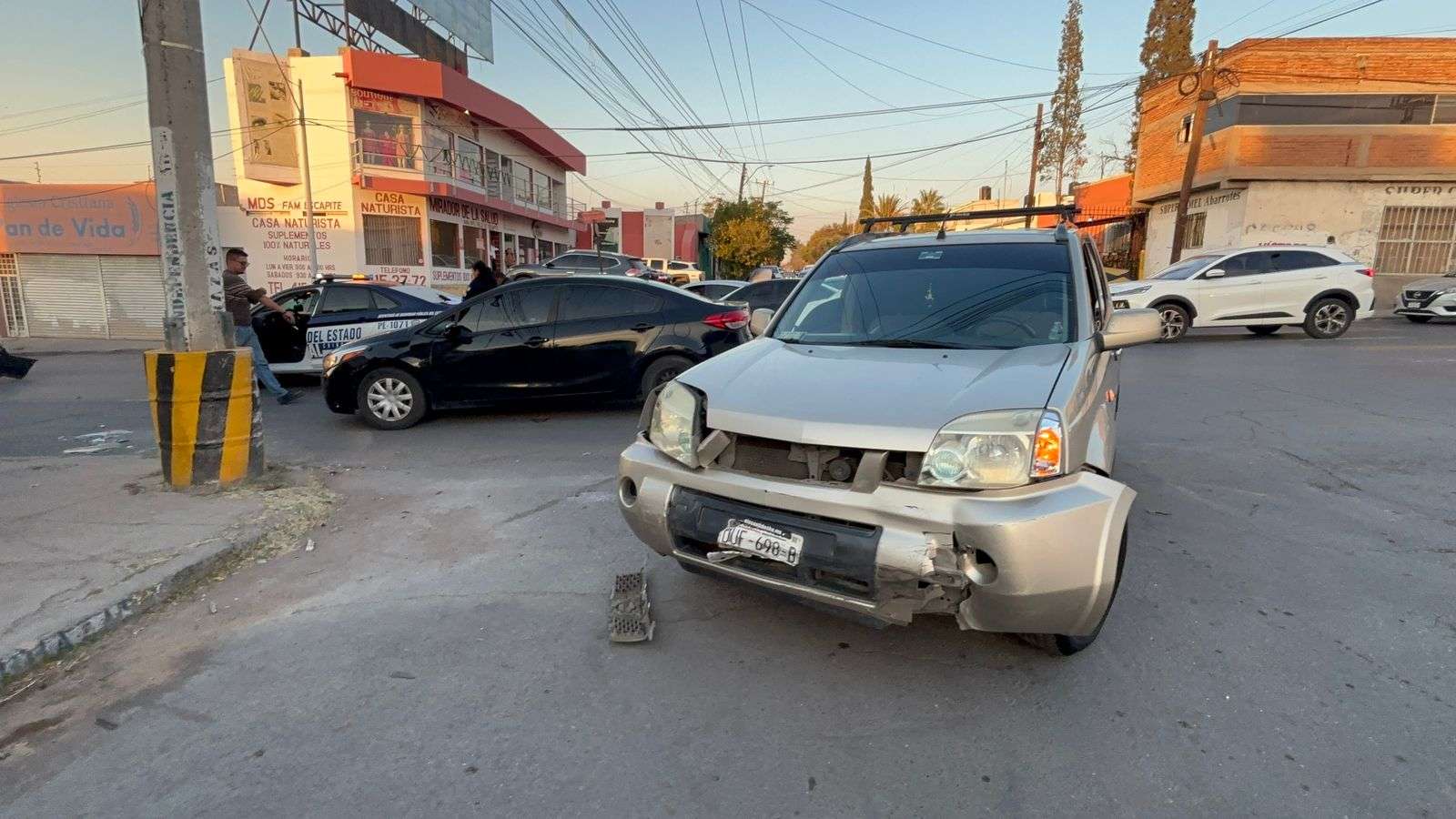 El choque se registró cuando una camioneta X-Trail circulaba de este a oeste por la calle Terrazas y al cruzar la avenida Independencia, un vehículo Versa, que circulaba por el sur-norte en el carril izquierdo, fue impactado y proyectado contra un poste.