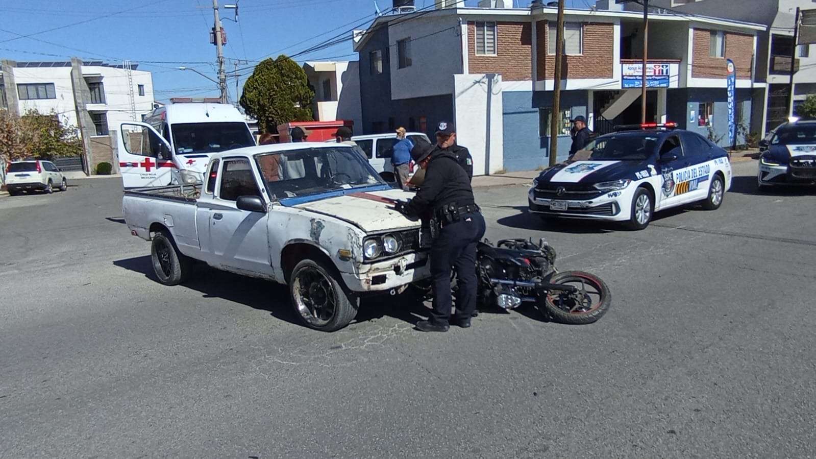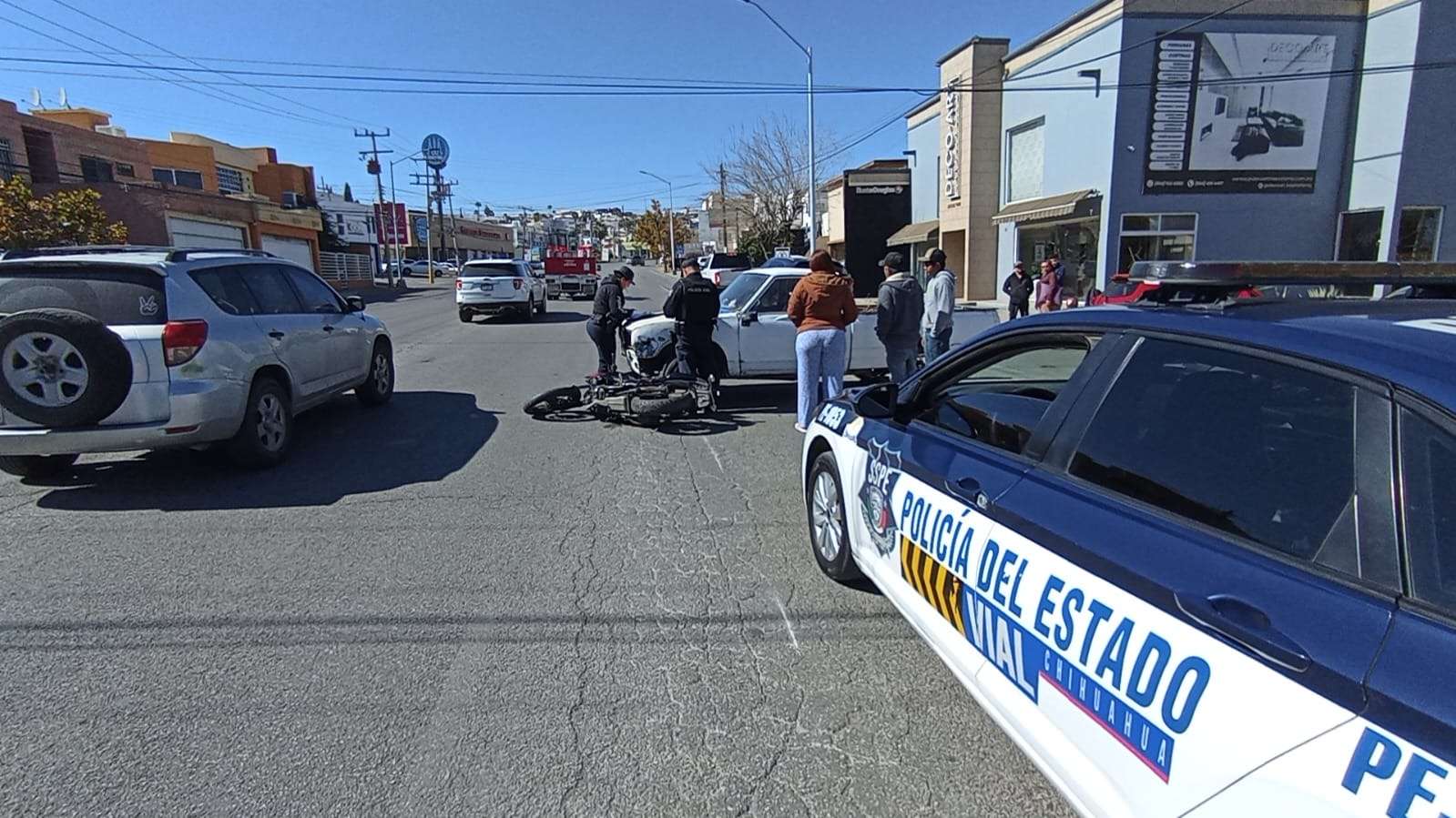Chihuahua.- Un joven de aproximadamente 25 años de edad resultó lesionado con una posible fractura en el brazo derecho, luego de verse involucrado en un accidente vial mientras circulaba a bordo de una motocicleta Gixxer Suzuki sobre la avenida Mirador.