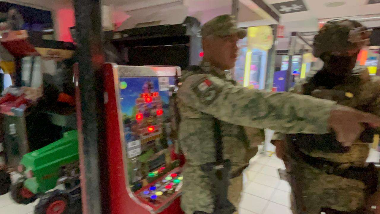 Personal de Sedena, Guardia Nacional, policía municipal, policía estatal y personal de Gobernacion municipal, acudieron esta mañana a la plaza de la tecnología, donde aseguraron al menos 60 máquinas tragamonedas.