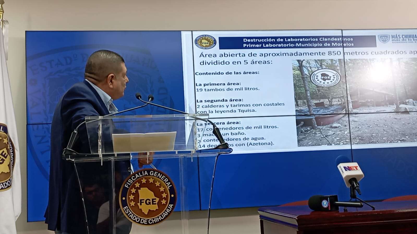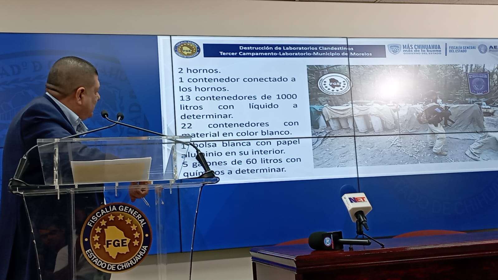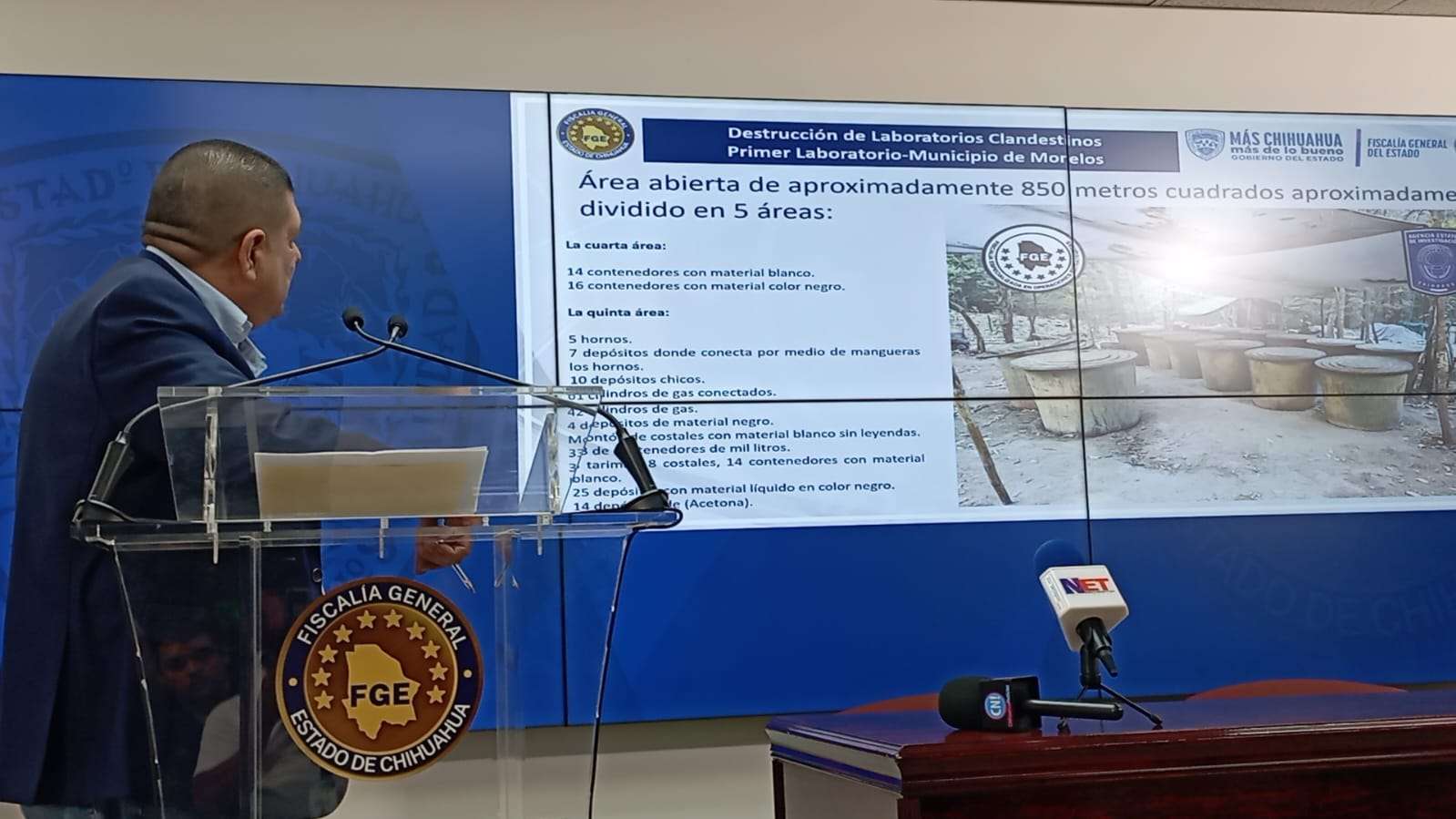Chihuahua. - Esta mañana en rueda de prensa el fiscal general del estado César Jáuregui Moreno dio a conocer el aseguramiento histórico a nivel nacional de un campamento laboratorio para la fabricación de drogas sintéticas localizado a 6 horas del municipio de Moleros con una superficie de 850 metros cuadrados divididos en 5 áreas.