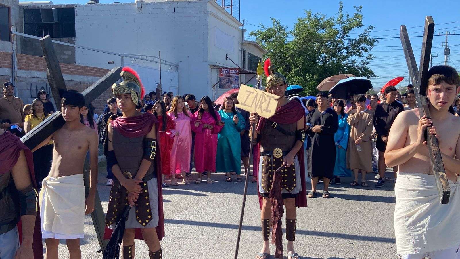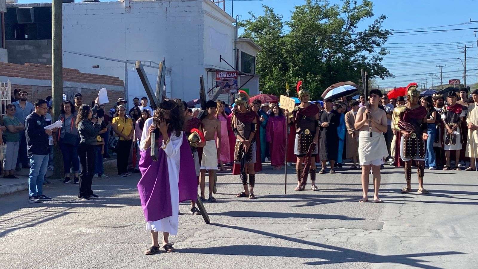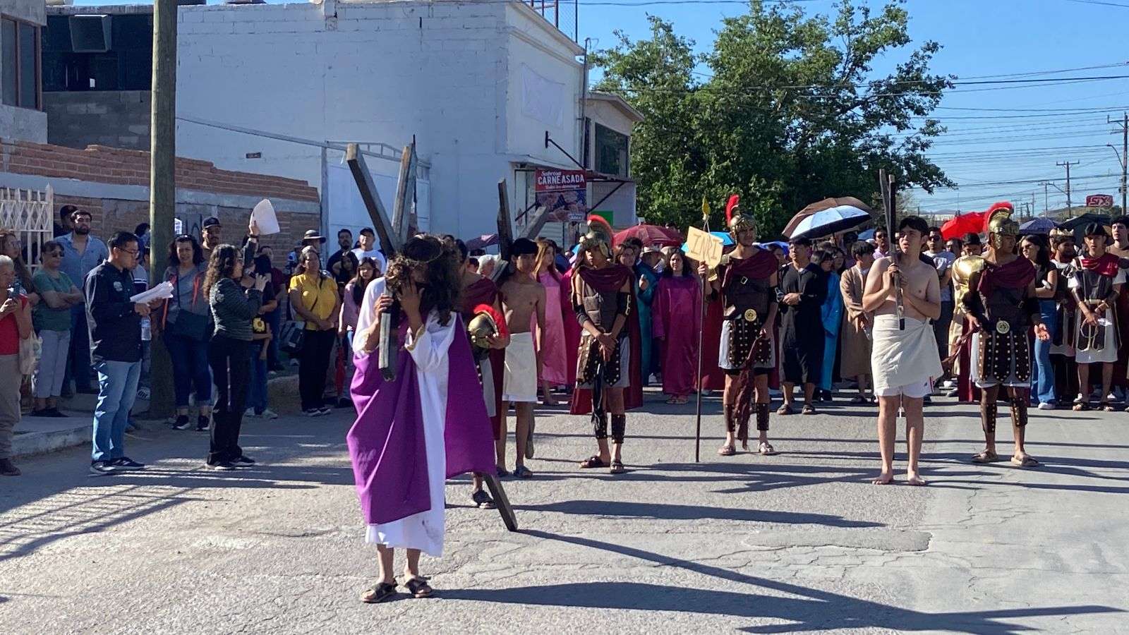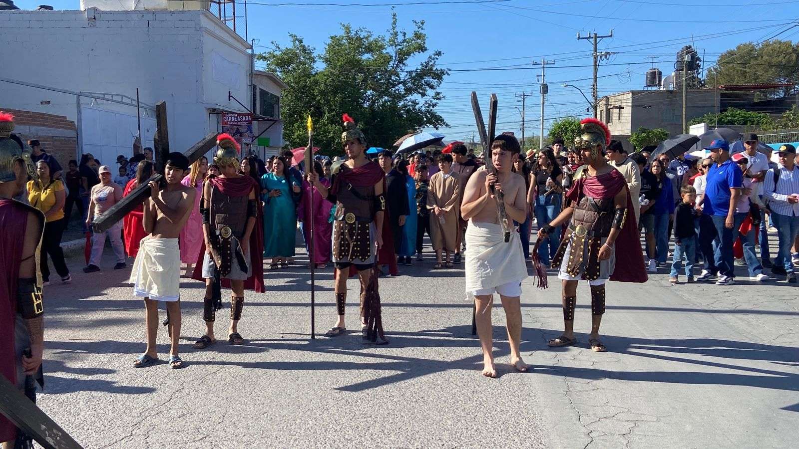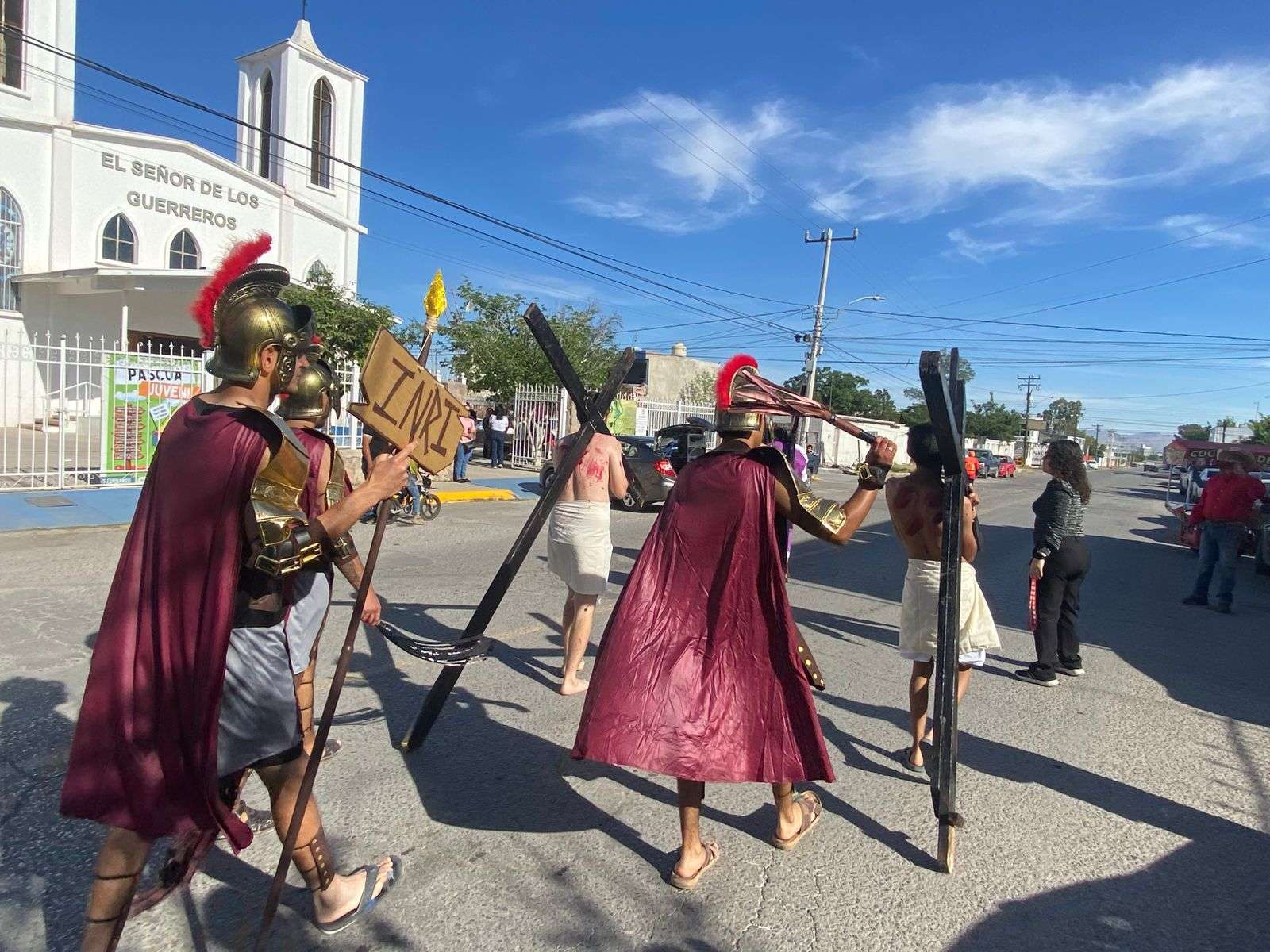 Chihuahua. - En un ambiente de fe y reflexión, este Viernes Santo se llevó a cabo el tradicional viacrucis viviente en la parroquia del Señor de los Guerreros, ubicada en la colonia Villa Juárez.