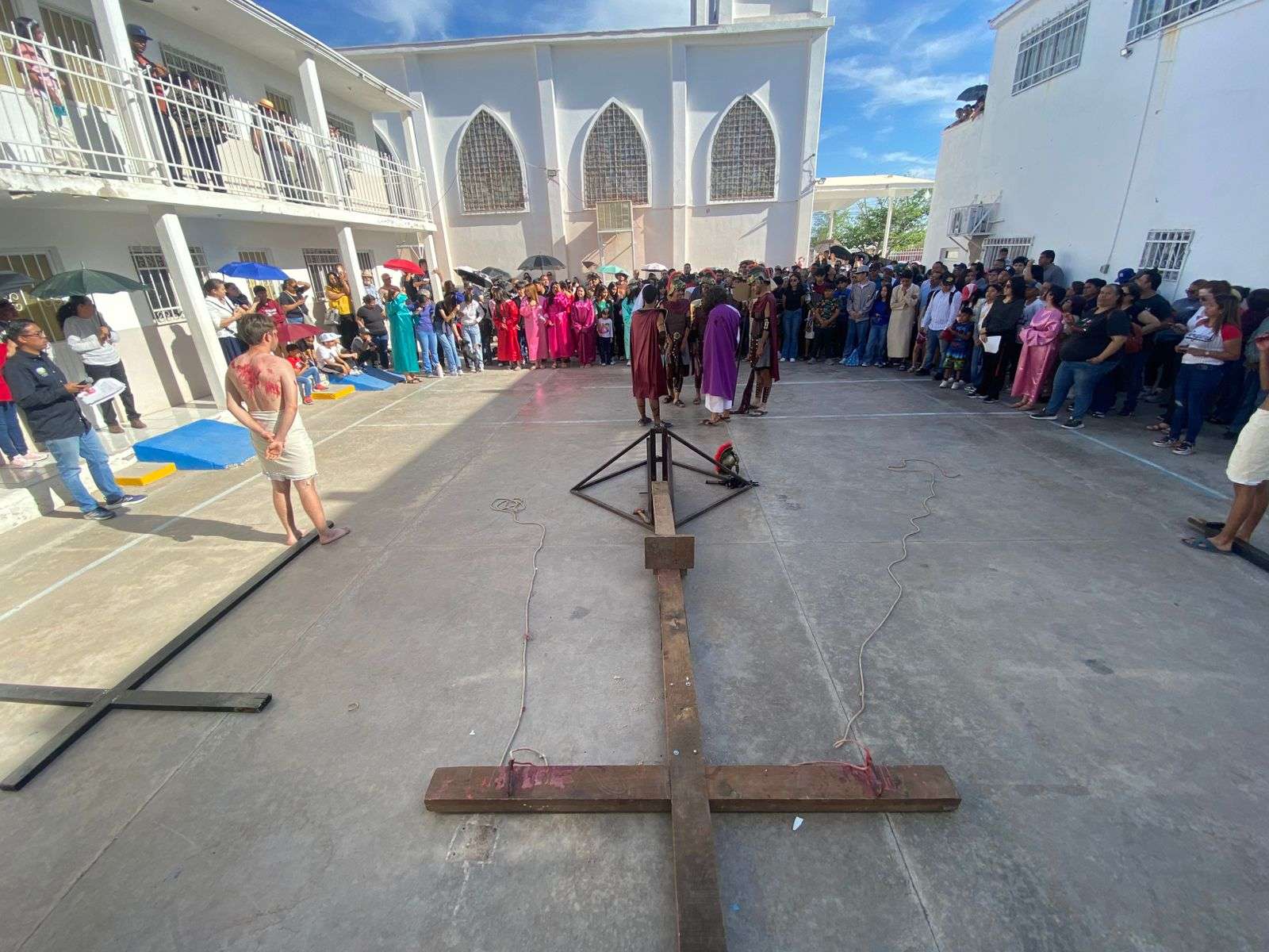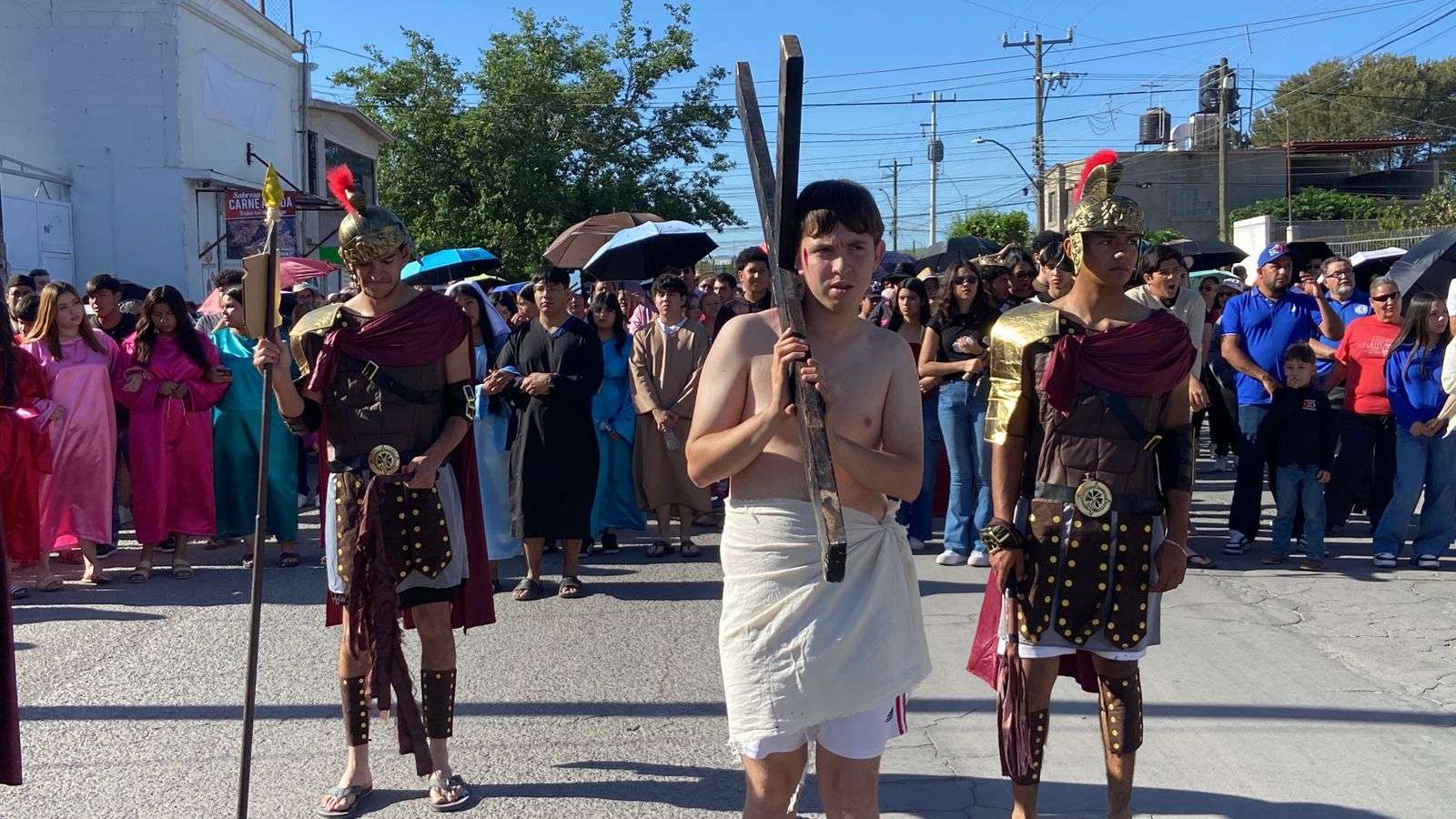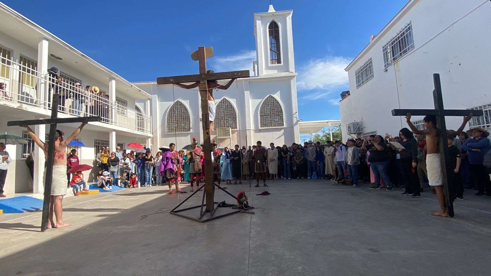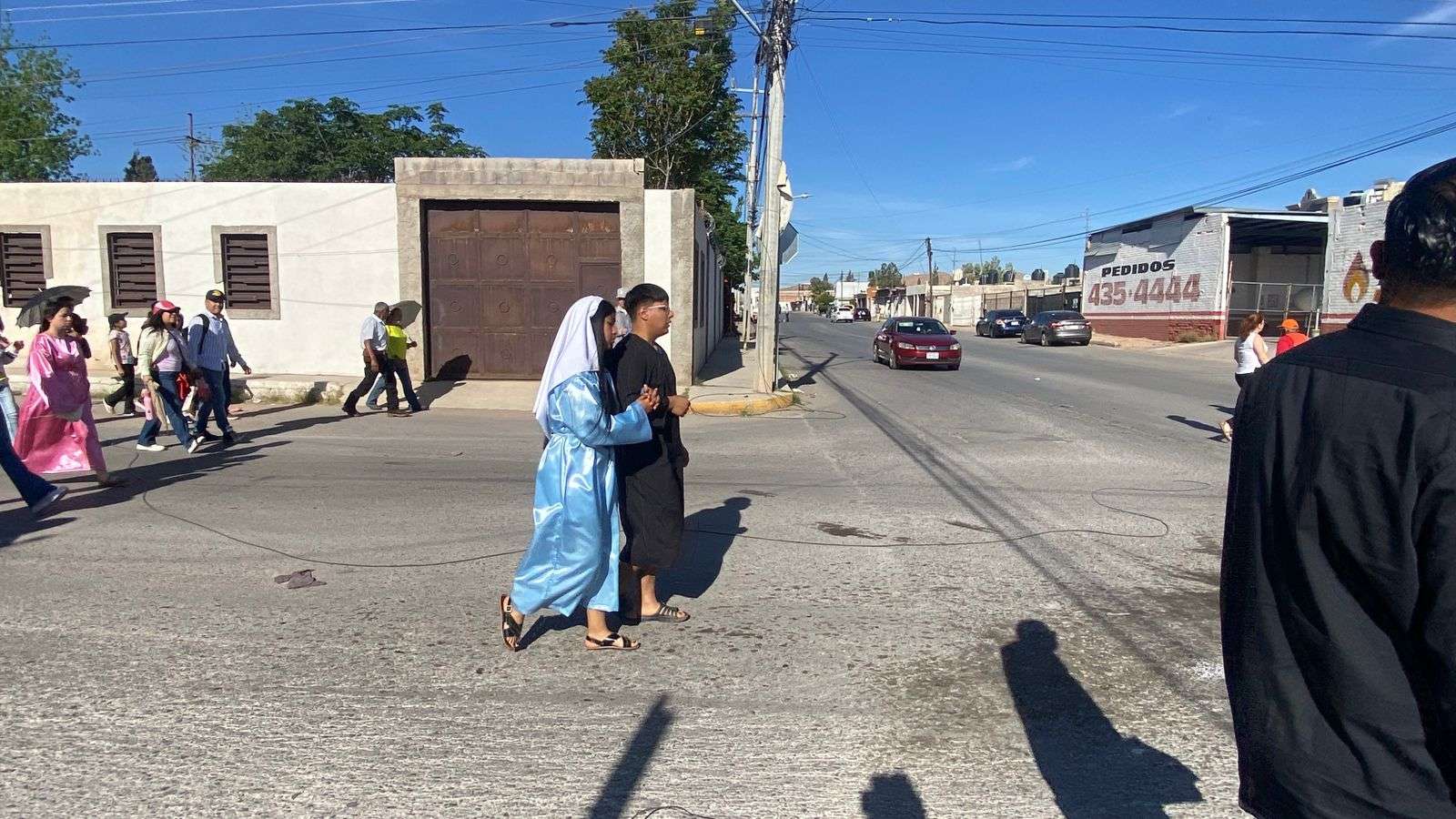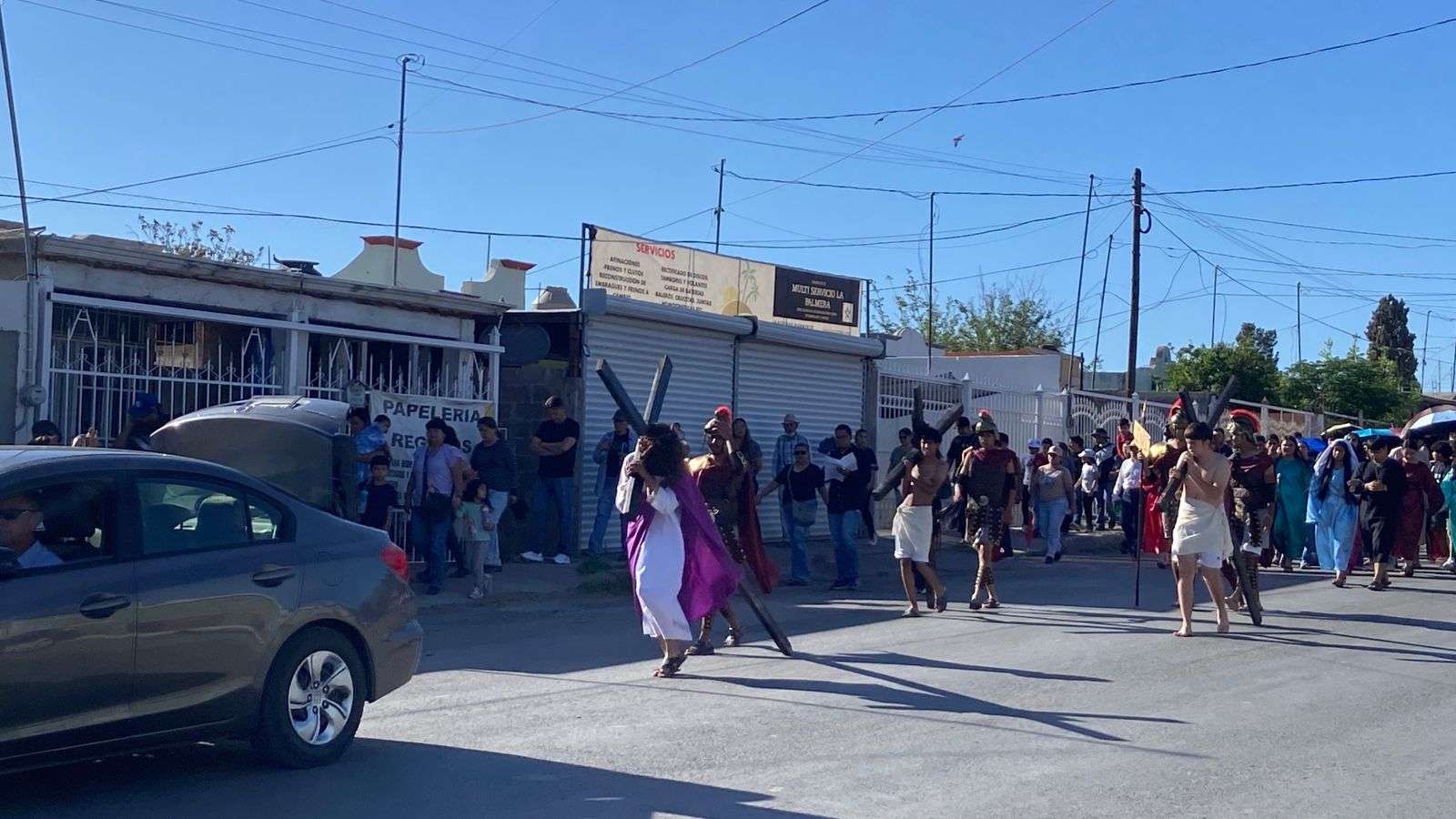 Chihuahua. - En un ambiente de fe y reflexión, este Viernes Santo se llevó a cabo el tradicional viacrucis viviente en la parroquia del Señor de los Guerreros, ubicada en la colonia Villa Juárez.