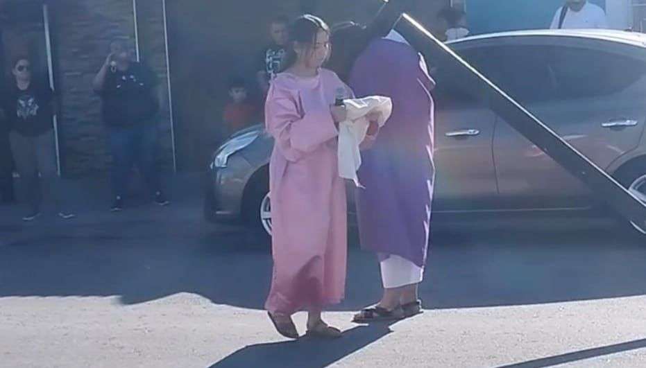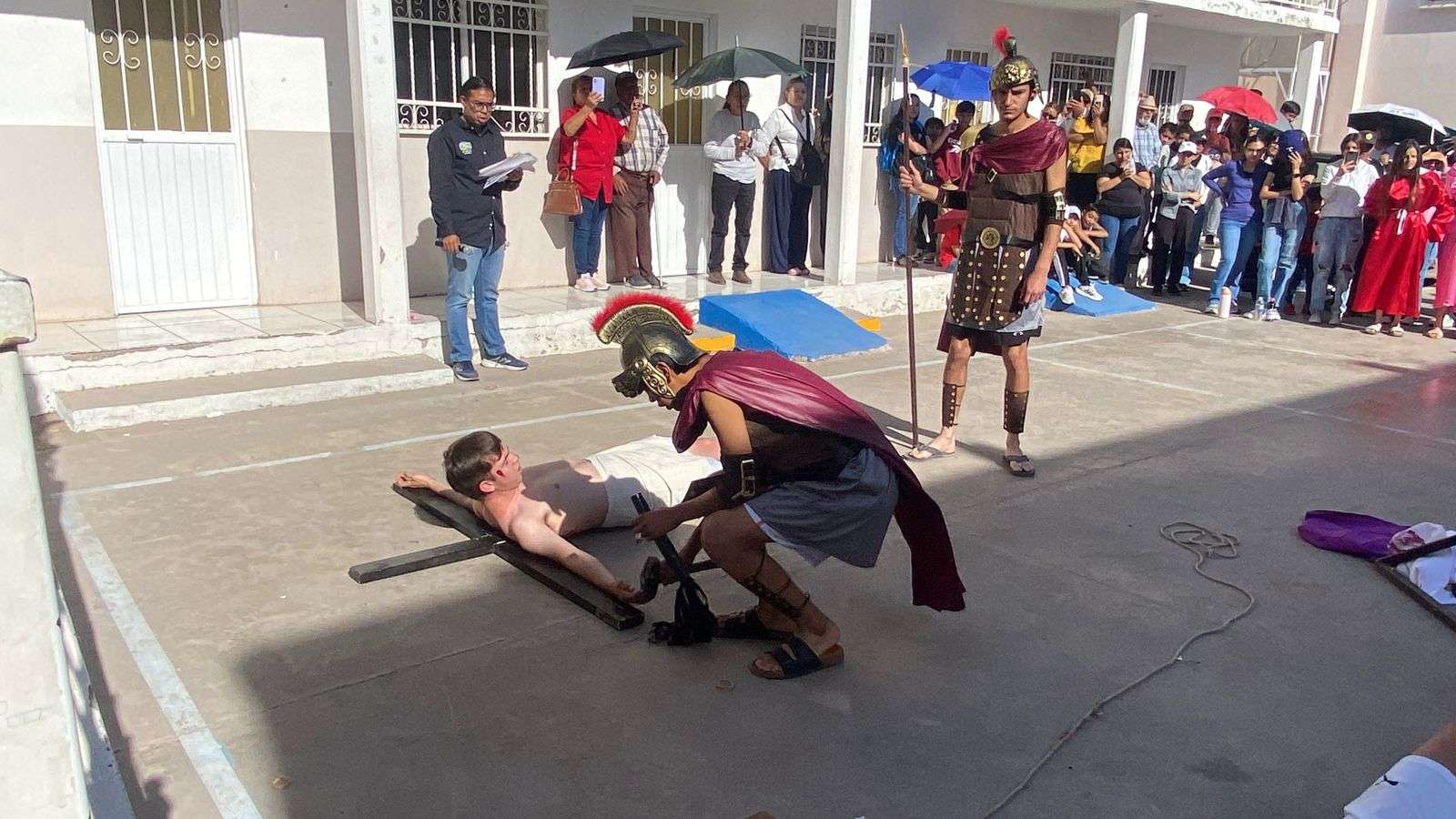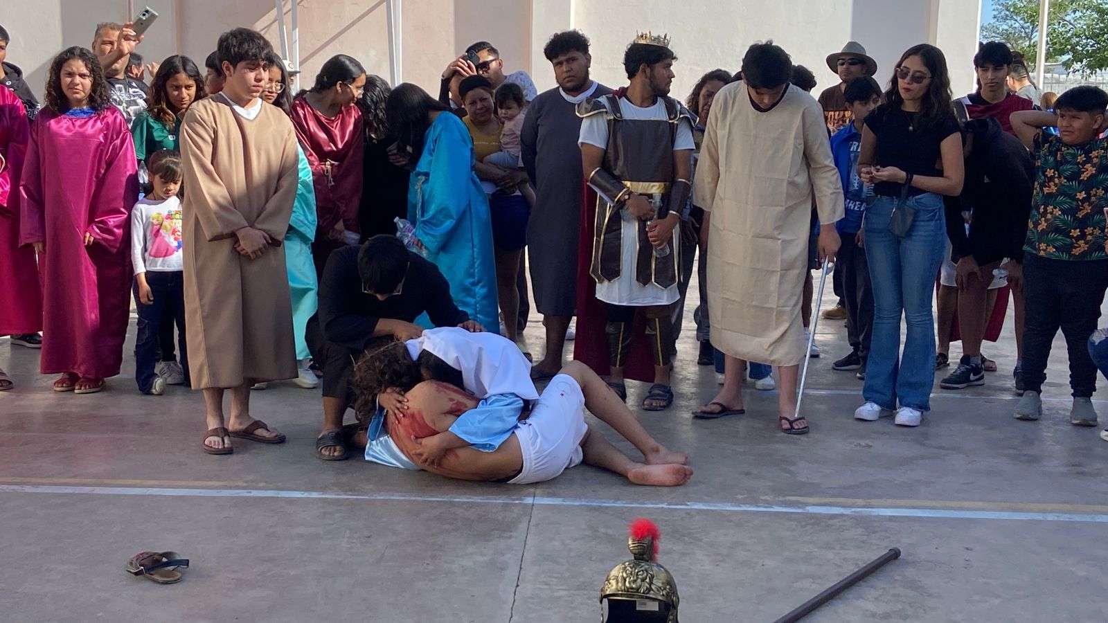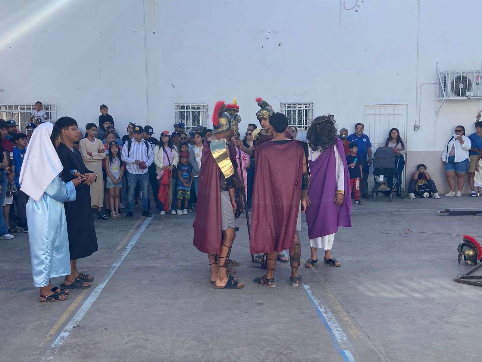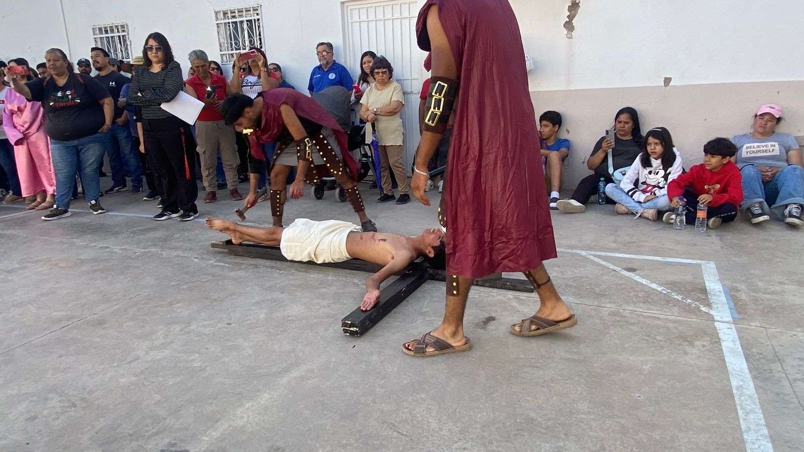 Chihuahua. - En un ambiente de fe y reflexión, este Viernes Santo se llevó a cabo el tradicional viacrucis viviente en la parroquia del Señor de los Guerreros, ubicada en la colonia Villa Juárez.