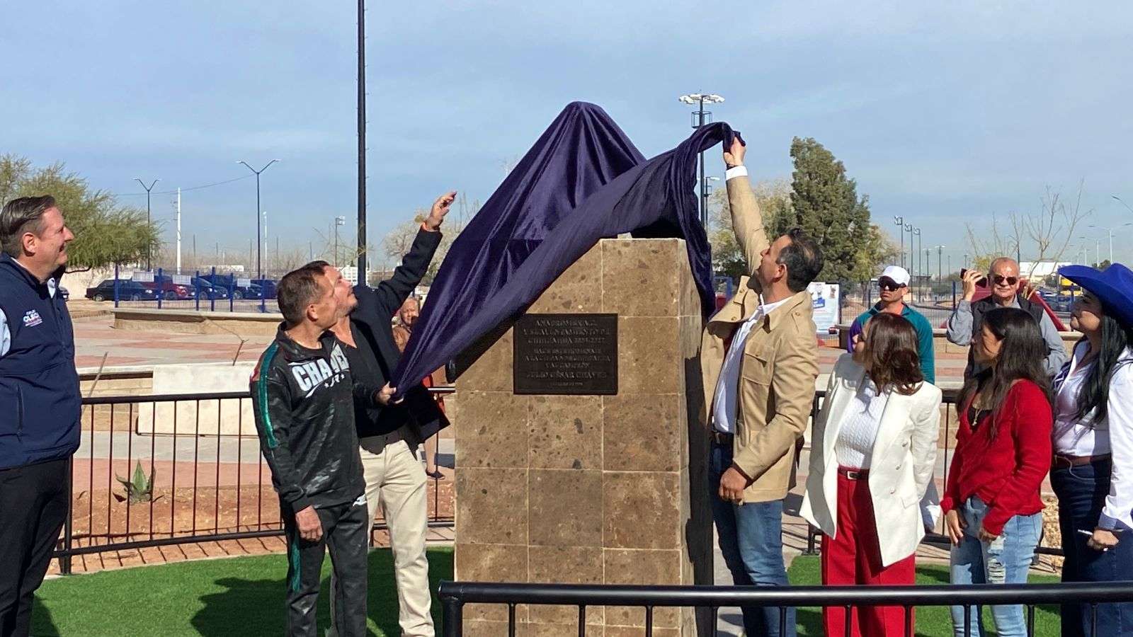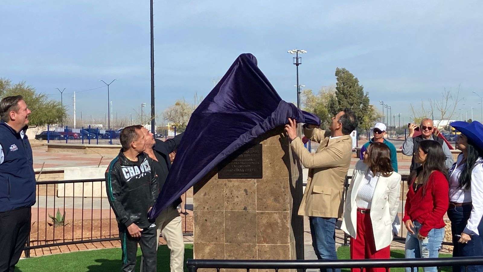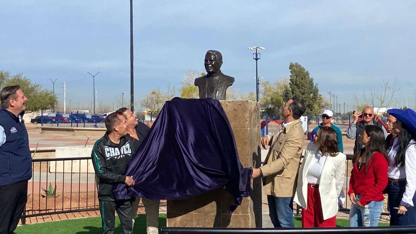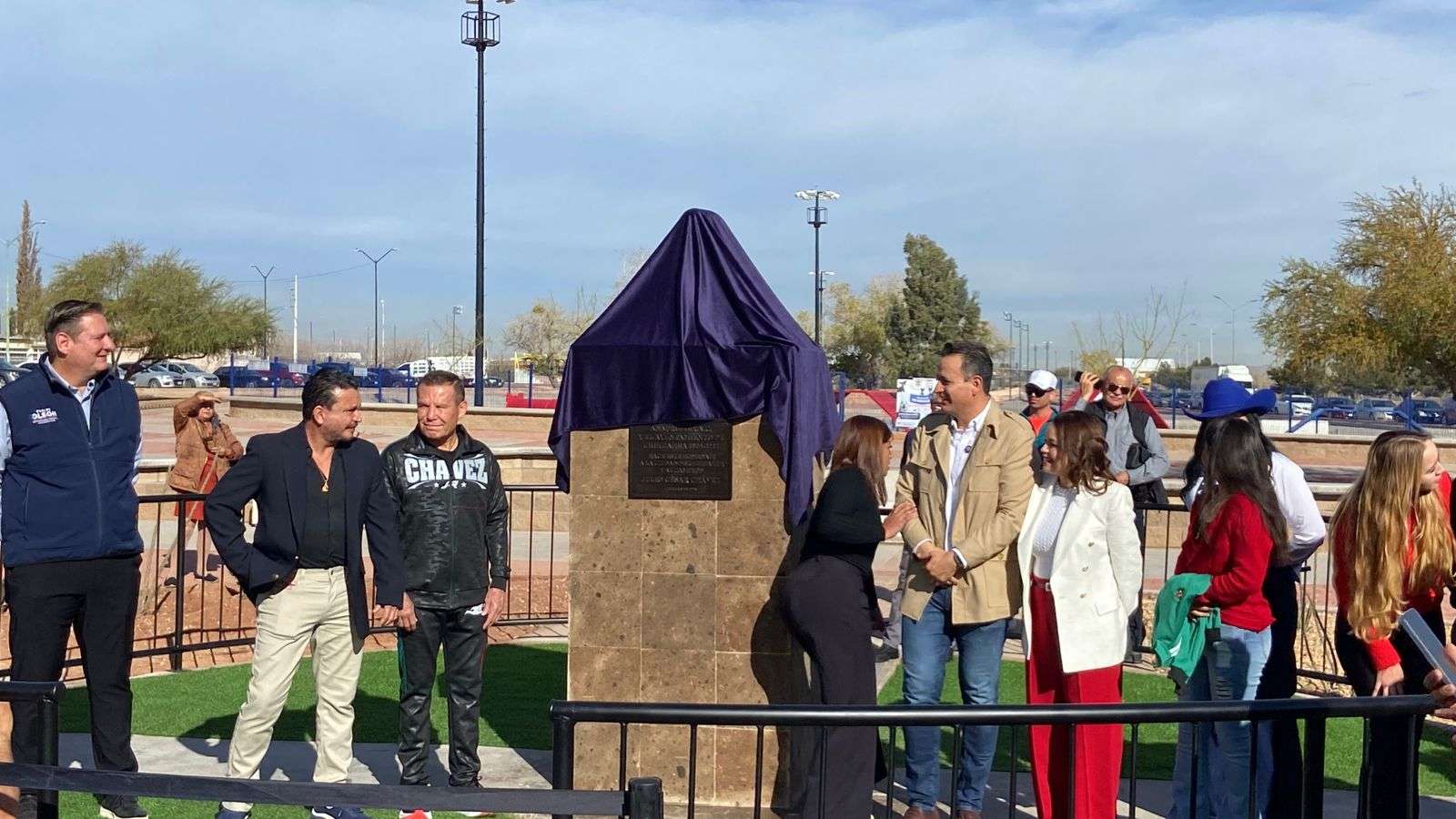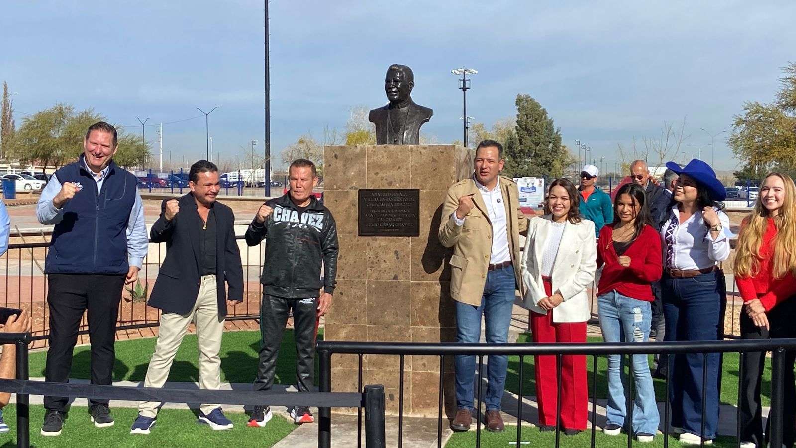Chihuahua.- El alcalde Marco Antonio Bonilla Mendoza y Julio César Chávez González, el gran campeón mexicano, develaron un busto en su honor por la gran trayectoria en su carrera boxística.