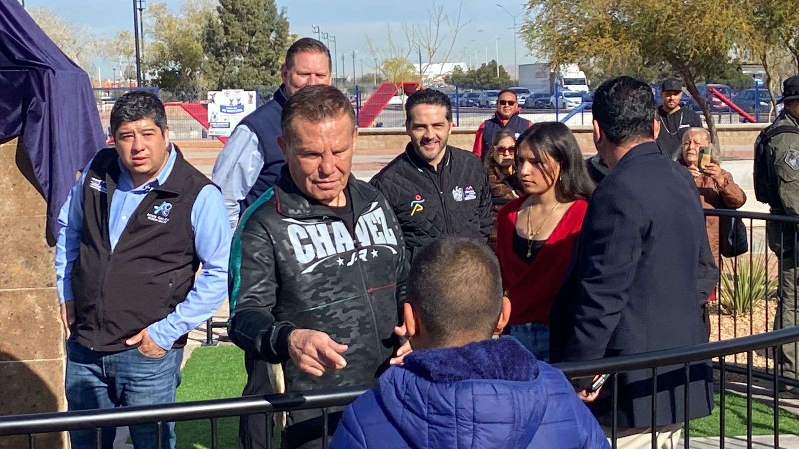 Julio César Chávez, enfundado en una chamarra con la imagen de su hijo, Julio César Chávez Jr., con una gran sonrisa agradeció el homenaje que se le realizó en el Polideportivo Luis H. Álvarez.