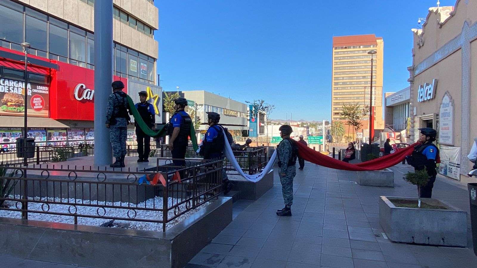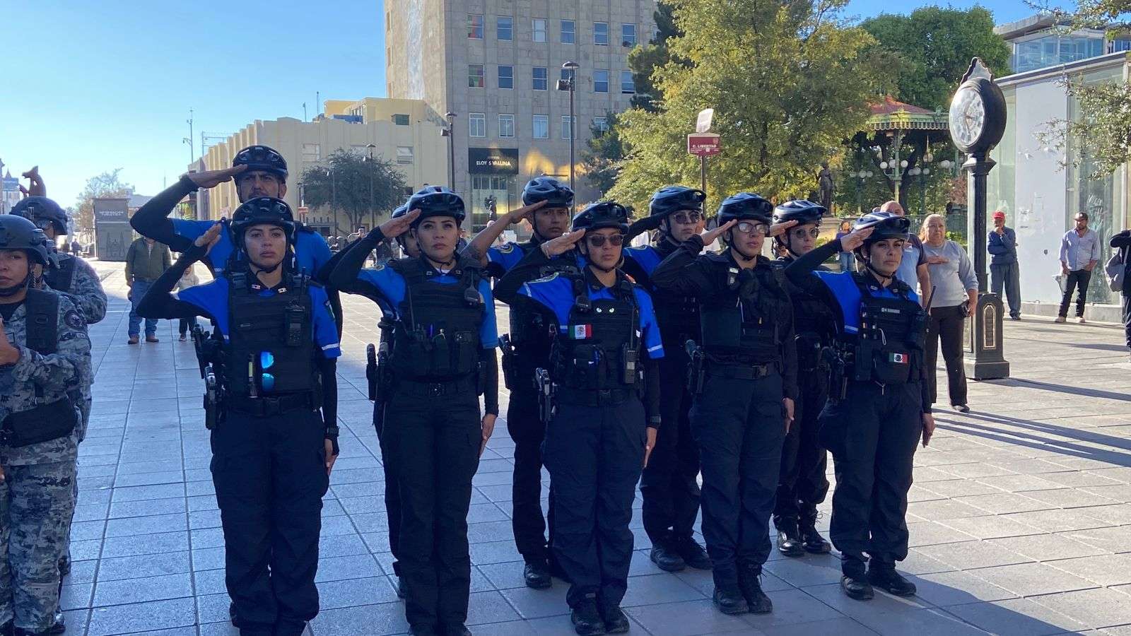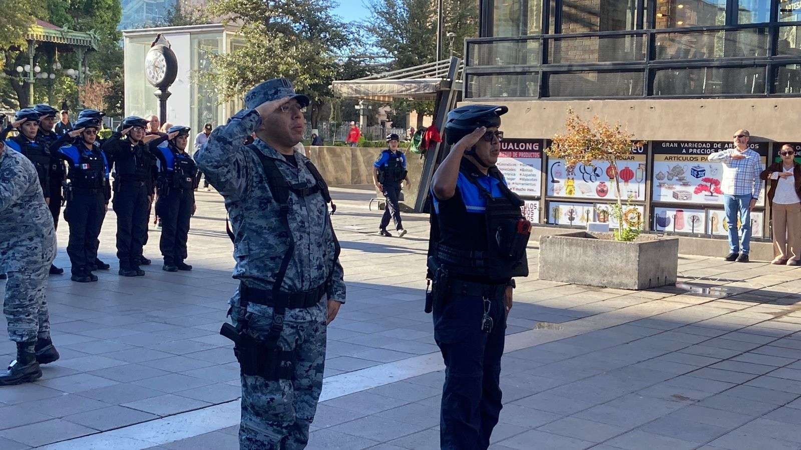 Chihuahua.- La Dirección de Seguridad Pública Municipal, en coordinación con la Guardia Nacional, realizaron el izamiento de la bandera como parte del acto protocolario de todos los lunes, denominado Lunes Cívico, en la Plaza de Armas.