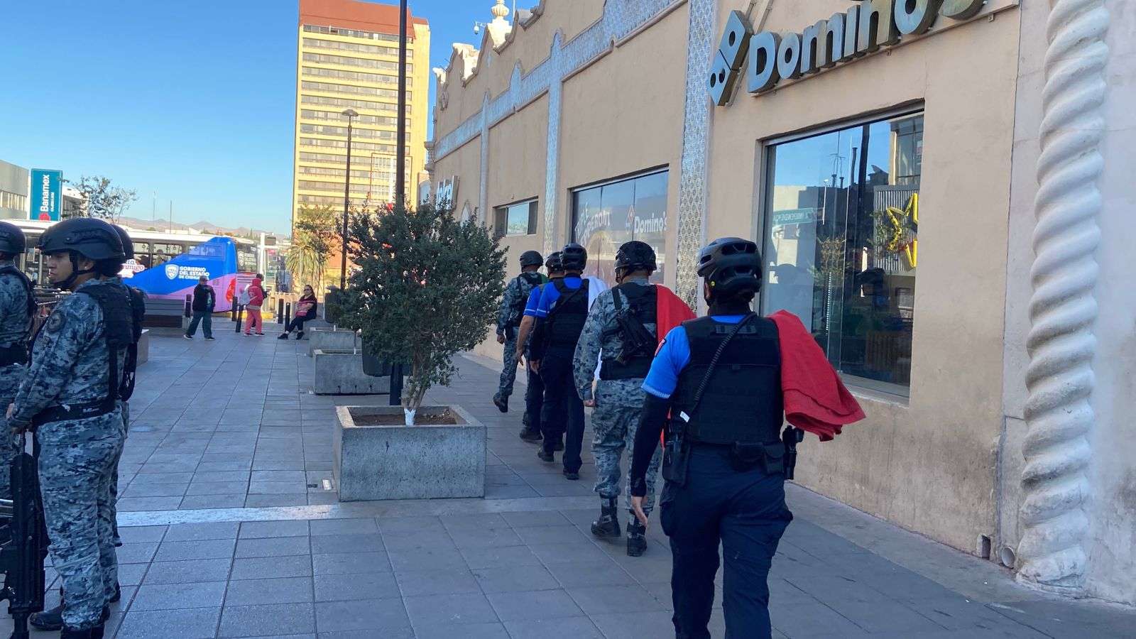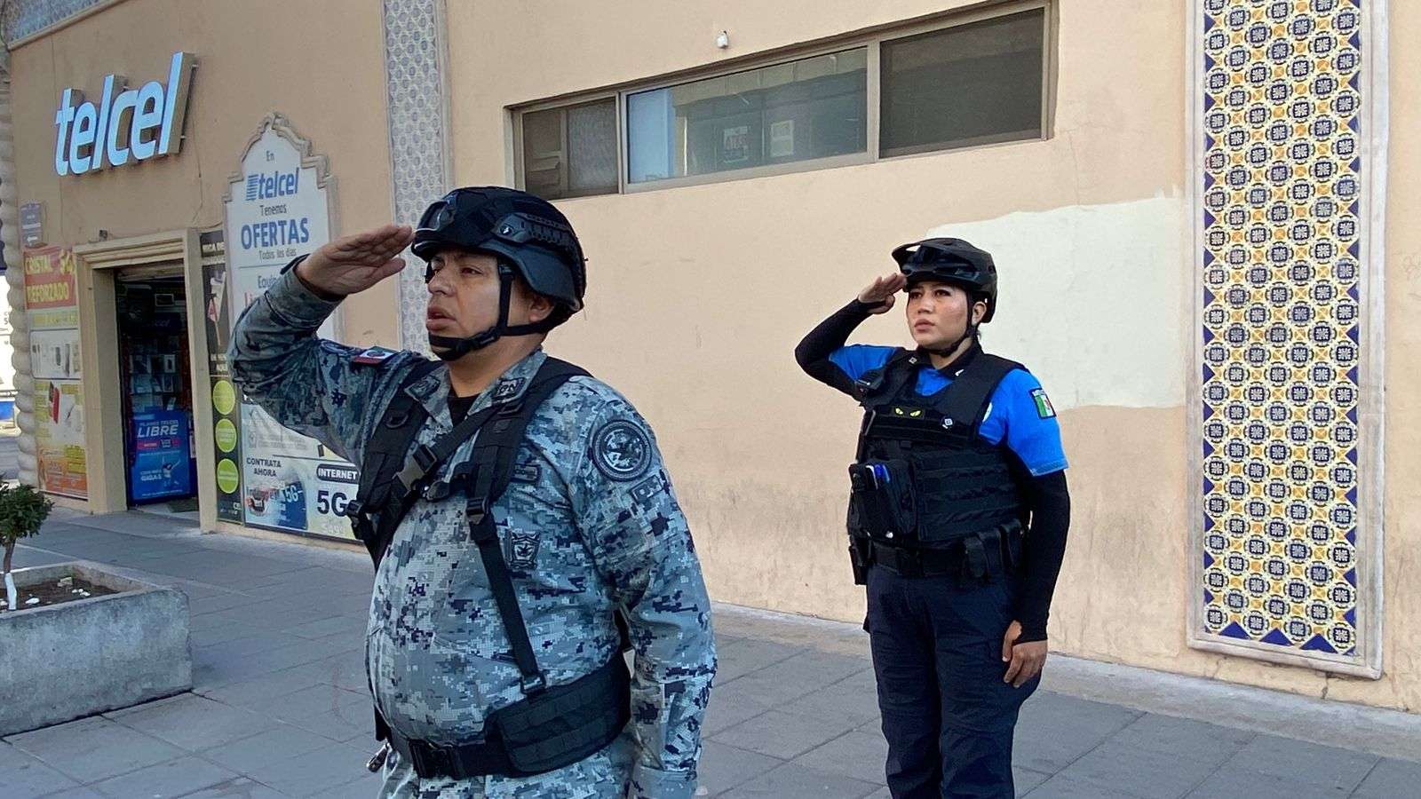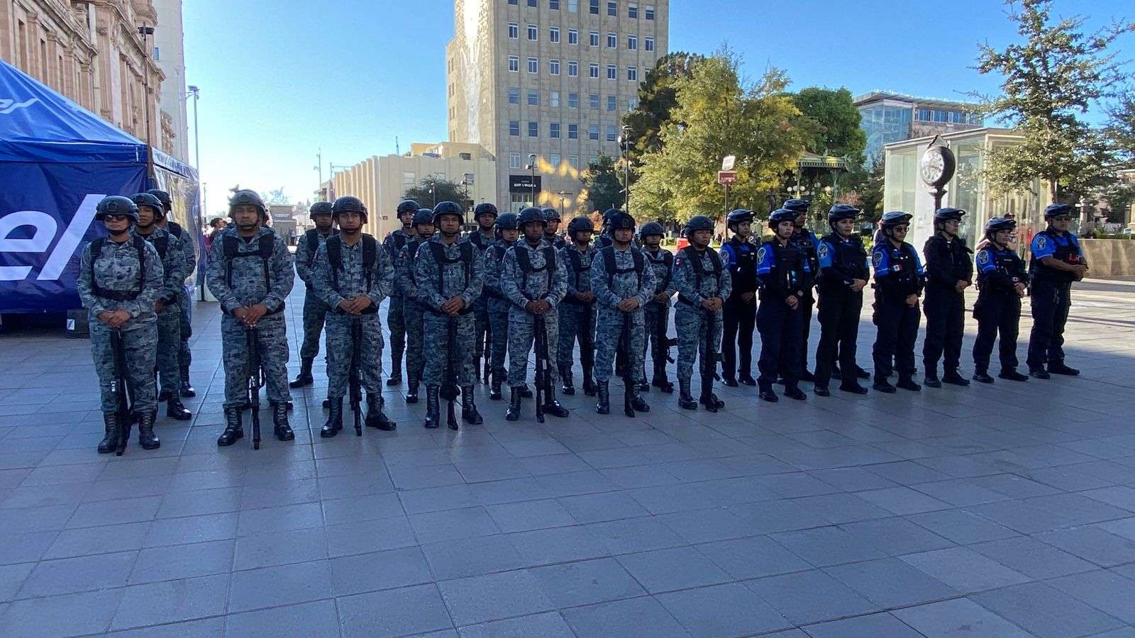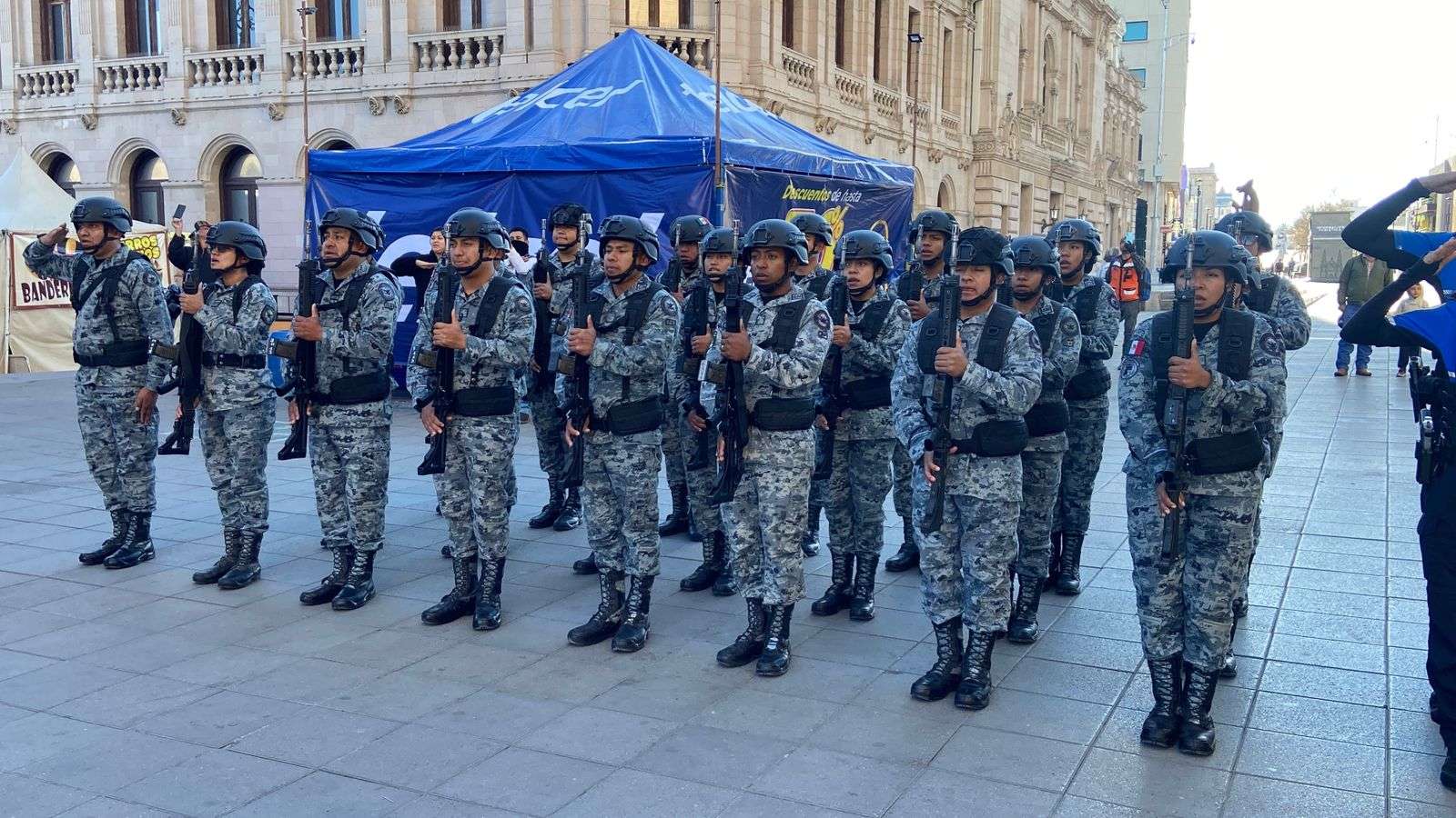 Chihuahua.- La Dirección de Seguridad Pública Municipal, en coordinación con la Guardia Nacional, realizaron el izamiento de la bandera como parte del acto protocolario de todos los lunes, denominado Lunes Cívico, en la Plaza de Armas.