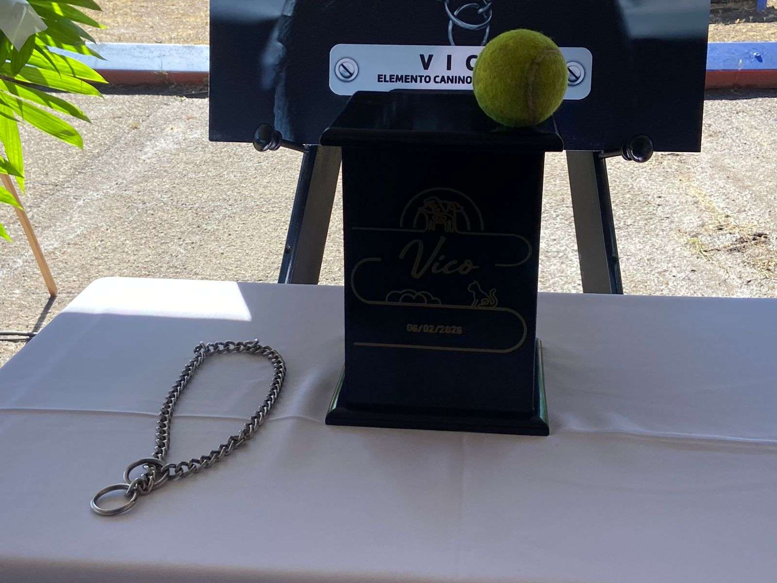 La urna donde descansan sus cenizas fue colocada junto con su correa de adiestramiento y su juguete, acompañada de tres coronas florales colocadas a un costado.
